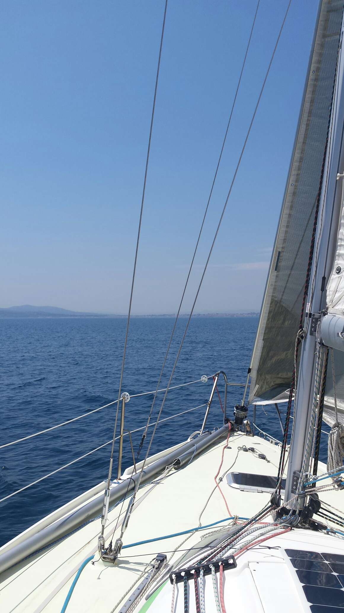 Enfin, le vent… pas au début où nous devions attendre de passer le cap de Creus pour commencer à le sentir. La première heure de nav se fit donc au moteur. A signaler un pêcheur en action de chalut pile sur ma route et surtout sans marques à son bord indiquant son action !!! Ce n’est qu’à environ 100m de lui que je remarquai son chalut à l’arrière. Je fis une embardée pour éviter son sillon.