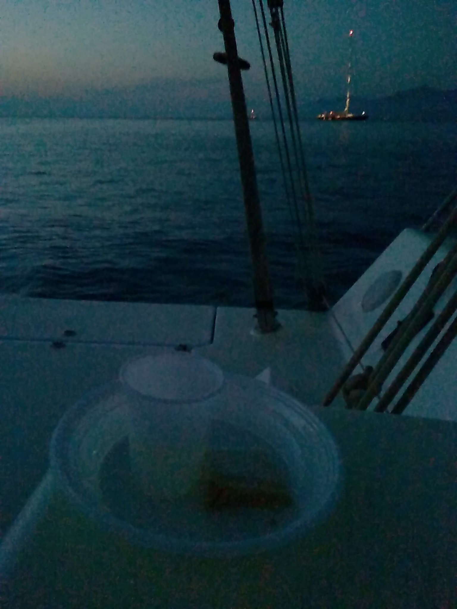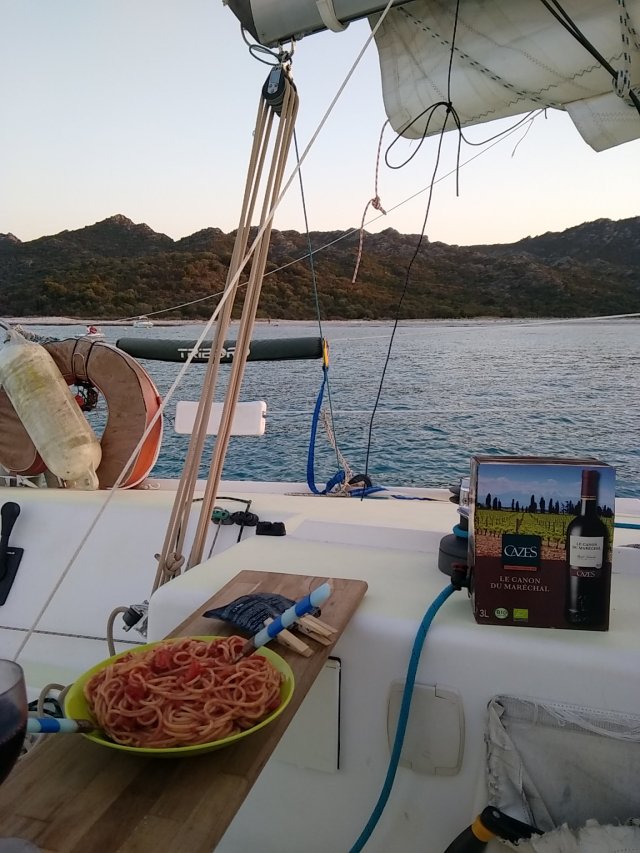 En l’honneur des nombreux bateaux battant pavillon Italien je me fis un bon plat de pasta al pomodoro dégusté sous leur regard amusé. L’un d’eux, à bord d’un bateau moteur avec ses 3 filles, vint à ma rencontre pour me proposer 3 morceaux de parmesan et un verre d’Asti Spumante ! Forza Italia !