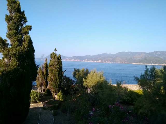 L’île d’Elbe apparut progressivement de la brume de chaleur pour nous offrir une côte très boisée et très différente de la Corse avec beaucoup de pins et quelques belles villas typiquement italiennes disséminées ça et là sur les coteaux en pente en direction de la mer. L’île est couverte d’arbres, de pins, d’eucalyptus, de cèdres, d’oliviers, de citronniers…