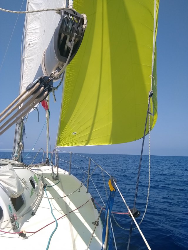 La navigation fut fantastique, la vitesse constante et le bateau réagissait à la perfection. Le pilote conservait son cap pendant que moi, je m’amusais à régler l’écoute du gennaker.