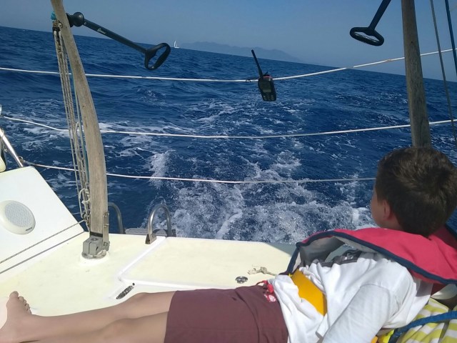 Le vent montait progressivement en régime m’incitant à affaler le gennaker en prévision d’un vent plus fort. La manoeuvre fut rapide et nous continuions sous grand voile et foc à une vitesse encore correcte de 6 noeuds. Mais le vent passa de 15 à 17 noeuds et nous dépassions ainsi les 7 noeuds. A cette vitesse nous allions débouler comme des balles en Corse ! La mer commença à se former un peu mais les passagers furent surpris de la stabilité du Babar qui naviguait en père peinard jamais inquiété ni de départ au lof. Bref le bonheur.