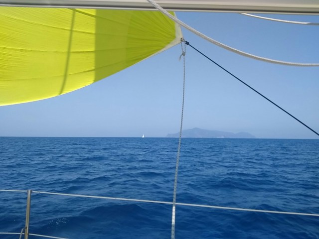 Pour la journée, c’était un vent de sud au programme. Toutes voiles dehors, le vent nous pris par le travers babord au cap San Andréa de l’île d’Elbe. D’emblée je mis le gennaker pour accrocher les 5 noeuds pour un vent de travers de 6 noeuds.