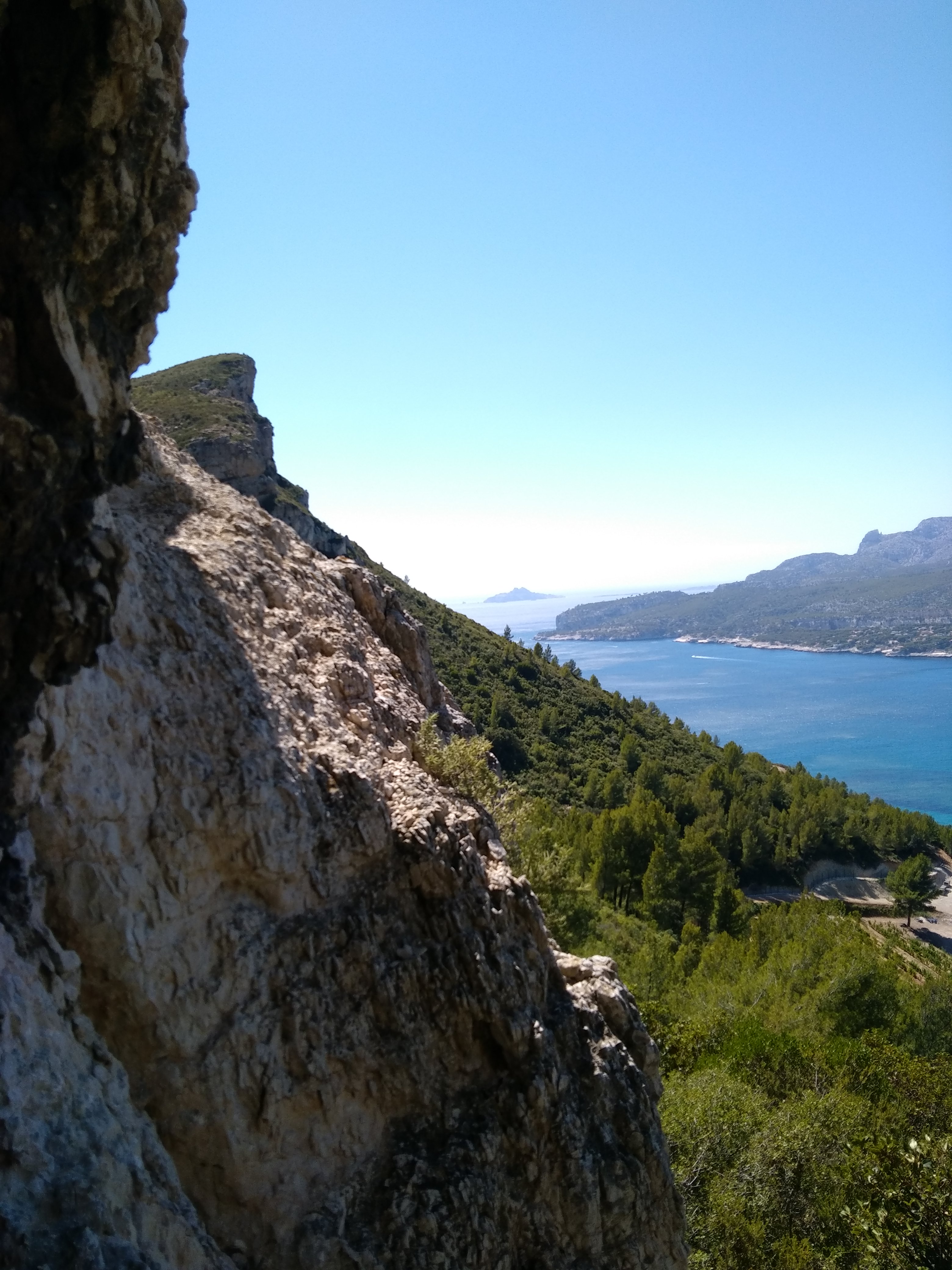 L’après midi je souhaitais aller faire un tour à Cassis mais le nombre impressionnant de voitures m’en dissuada. La route des crêtes étant fermée pour cause de grand vent je me contentai d’une balade sur les hauteurs de la magnifique baie de Cassis. Je vis un voilier au mouillage dans l’anse de l’arène qui semblait protégé du mistral. A noter…