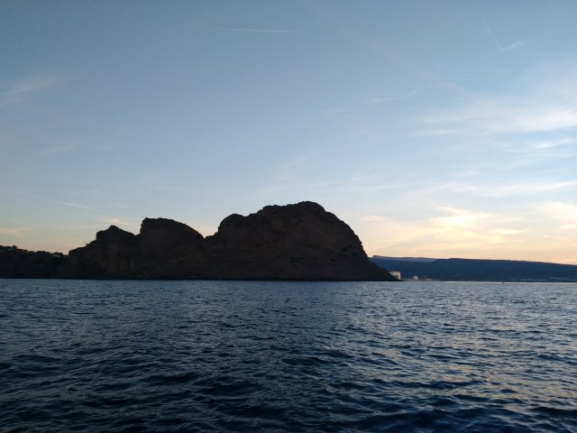 Le début de la nav fut soumis à un vent variable, me faisant alterner voile et moteur. Je dus attendre de dépasser le cap Croisette à la sortie des calanques pour toucher un vent plus régulier. Le plus pénible sur cette partie de navigation était la houle d’ouest de près de 1m qui freinait le bateau et rendait la navigation difficile. Je pus néanmoins apprécier le fantastique paysage des calanques de Marseille, pour moi un des plus beau qui existe. Dommage que la politique cède si facilement aux sirènes de l’économie contre l’environnement en ayant autorisé une usine de je ne sais quoi de continuer à déverser ses rejets à la mer pendant 7 ans !