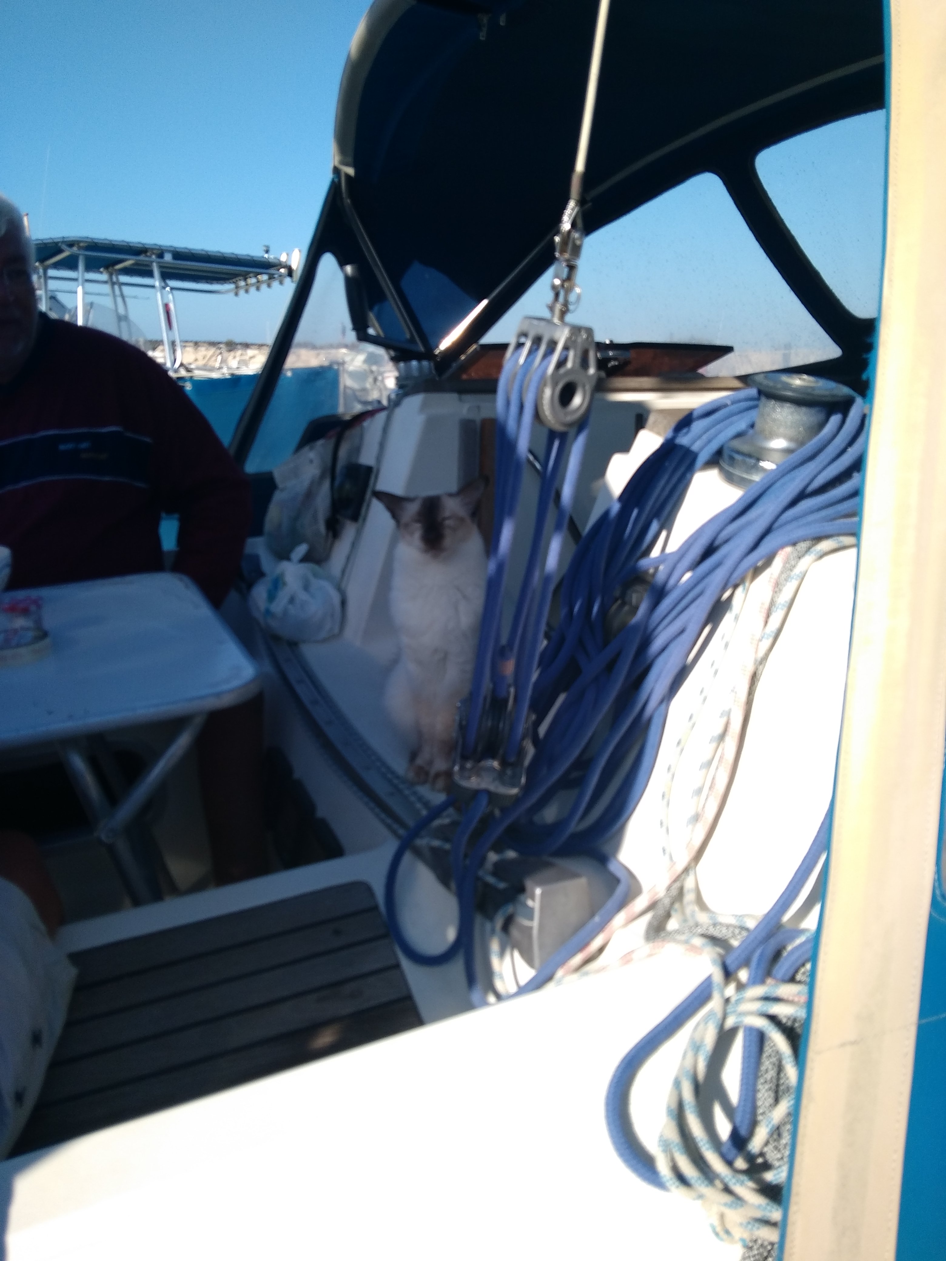 Ce fut sous gennaker que j’arrivai devant le port des Saintes Maries de la mer ma prochaine escale. Je craignais rencontrer des hauts fonds et de nombreux casiers de pêche, il n’en fut rien et j’entrai tranquillement dans ce très joli port. On m’installa à côté d’un autre Pogo 850 des Glénans. A son bord, le skipper accompagné de 2 stagiaires ados. Notre échange fut cantonné à l’environnement nautique. L’ambiance sur le ponton était sympathique avec une population bigarrée. A côté de moi un bateau avec à son bord un couple de retraités et 2 chats ! J’appris qu’avoir 2 chats à bord permettait à chacun de mieux s’accommoder de la navigation.