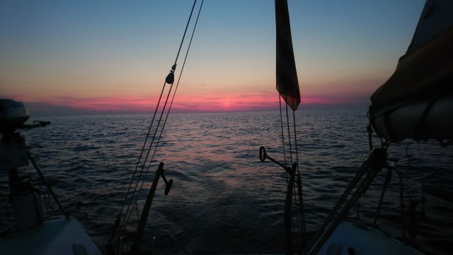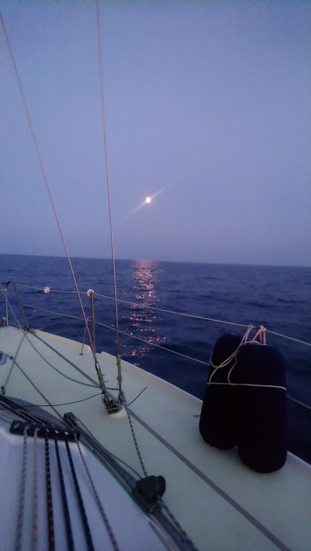 La nuit fut enchanteresse avec un double coucher de soleil et lever de lune le tout dans une douceur délicate. Moi j’écoutais de la musique tranquille en rêvassant sur l’onde.