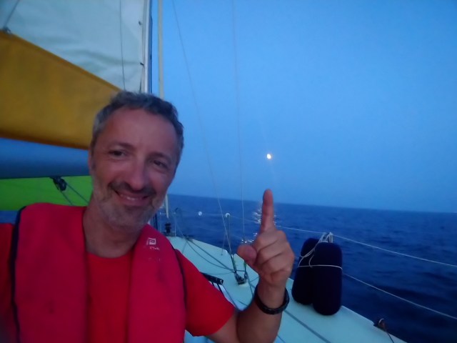 Les prévisions se sont avérées exactes ! J’étais sous gennaker du départ jusqu’à 22h pour finir la nuit dans un près d’est tantôt forcissant tantôt évanescent. Le passage du canal du Rhône était évidemment la partie la plus délicate à gérer de nuit avec des cargos empruntant le rail dans les 2 sens.