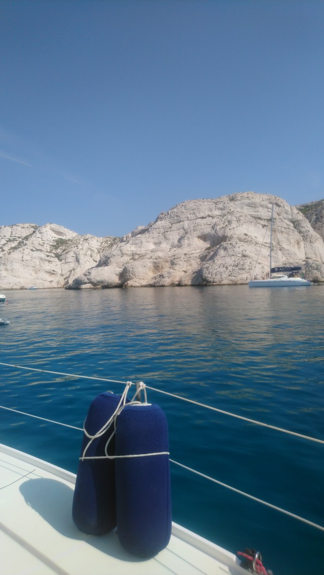 La nuit fut monstrueusement bonne. J’ai dormi 10h ! Ça faisait longtemps que cela ne m’était arrivé. Le matin fut consacré aux courses du bord en vue de préparer la croisière dans les calanques. Le départ était prévu à 16h pour naviguer de nuit à la fraîche et en profitant d’un bon vent.