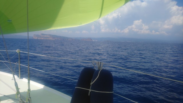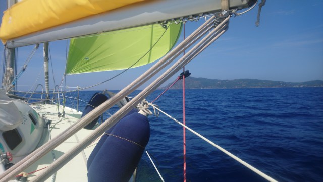 Réveil en douceur en cette énième matinée au mouillage… À 7h30. Aucun bruit sur le plan d’eau à part un léger clapotis qui laissait augurer le frémissement d’un petit vent. Un peu embrumé de sommeil je me préparai un petit déjeuner avant d’appareiller doucement en direction du sens inverse et un retour en étapes au pays. Je préparai les voiles, mis un léger coup de moteur, larguai les amarres et glissai sur l’eau de miroir. Je ne m’étais pas trompé. Un vent de 6 à 8 nœuds s’était réveillé en même temps que moi. Très vite j’arrivai au bon plein à dépasser l’île du Grand Ribaud qui marque l’entrée de l’île de Porquerolles. Et le vent progressivement tourna et m’invita à lancer mon gennaker que je ne devais plus quitter de la journée…