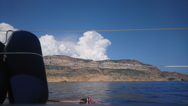 Et à partir de là c’est une navigation d’initiés qui m’attendait pour toute la journée. À guetter la petite risée, régler les voiles pour profiter au maximum des maigres volutes d’air. Heureusement que mon fidèle pilote avait pris le relais car je n’aurais pas supporté barrer en plein soleil qui n’a jamais été aussi mordant que cette année. Je lisai à l’ombre des voiles et regardai par moment l’horizon et la terre défiler au loin. Une foule de pensées se présentait à moi et je les accueillai toutes avec introspection : des chers disparus, les femmes, l’amour, la famille, le monde, le temps qui passe, les amis… La journée a ainsi défilé sans que je ne me rende compte du temps.