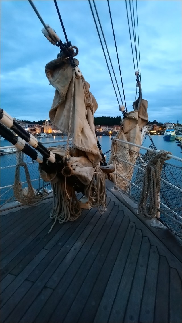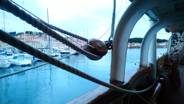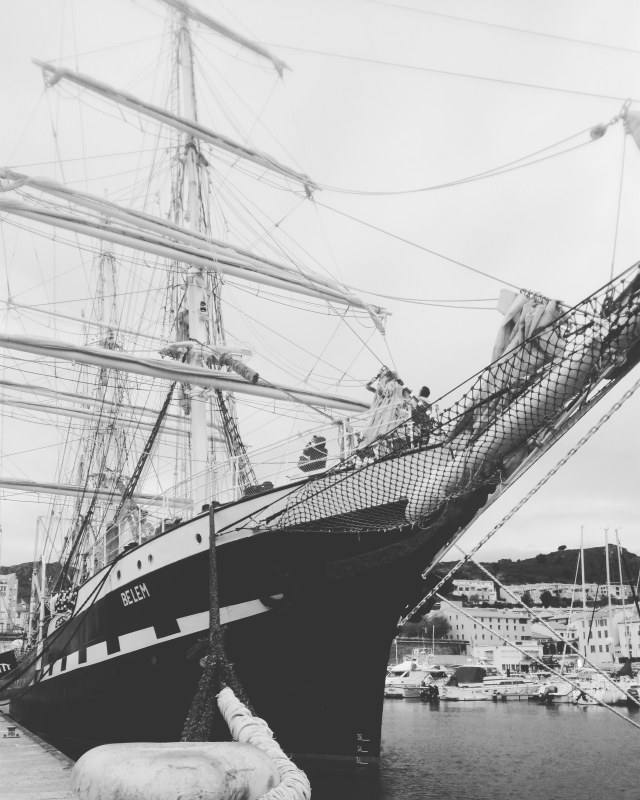 C’est pas grave je vais attendre que Eole se réveille un peu. En attendant je rêvasse, lis, peaufine mes réglages. Je repense à ma journée d’hier… Qui fut très agréable avec une balade dans Perpinyà en mode reportage photo et ensuite l’après midi, la visite du célèbre Belem stationné en hivernage à Port Vendres. Le navire de 120 ans reste superbe avec un équipage à ses petits oignons. Ses bois sont bien entretenus et ses cuivres rutilants. Je discutai avec un matelot pendant un long moment.