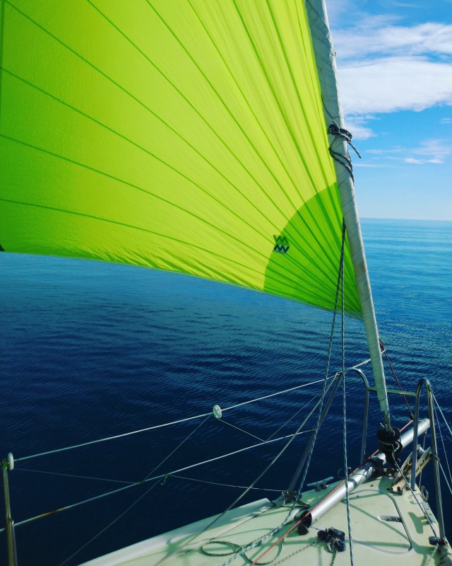 Vers le large un attroupement d’oiseaux de mer semble indiquer la présence de bancs de poissons. Peut être des dauphins aussi… Le vent ne me permet pas d’y mettre le cap. Ou devrais je dire l’absence de vent pour l’instant. Le bleu prédomine de partout, le ciel, la mer, l’horizon… Tout se confond dans un juste équilibre. Et moi, tel un funambule qui gambade joliment sur ce fil invisible, je suis enthousiaste et heureux.