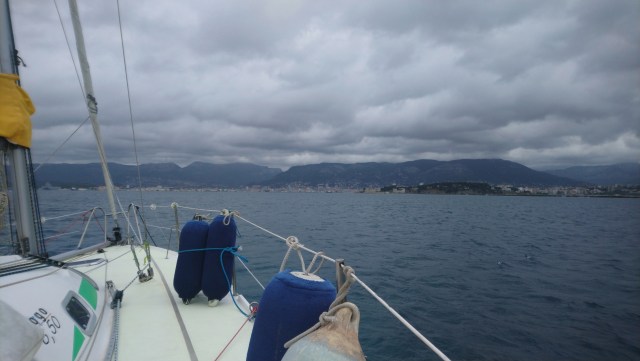 Dès la sortie du port, un vent froid et humide me fait comprendre que la navigation prévue jusqu’à Toulon de 15 milles va être dure. Je commence avec un ris dans la grand voile pour naviguer au près serré jusqu’à Porquerolles.