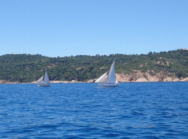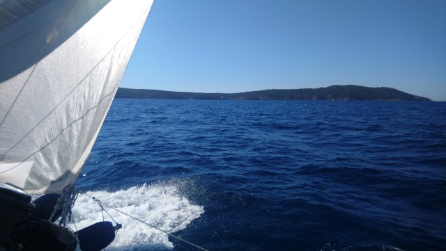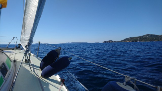 Je suis parti ce matin depuis Bormes avec une sale rhinopharyngite qui m’a pris dans la nuit. Ça m’apprendra a faire le malin torse nu en mer… Le vent est excellent et soutenu. Il m’oblige à faire un près serré jusqu’au cap Lardet.