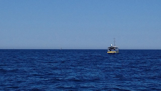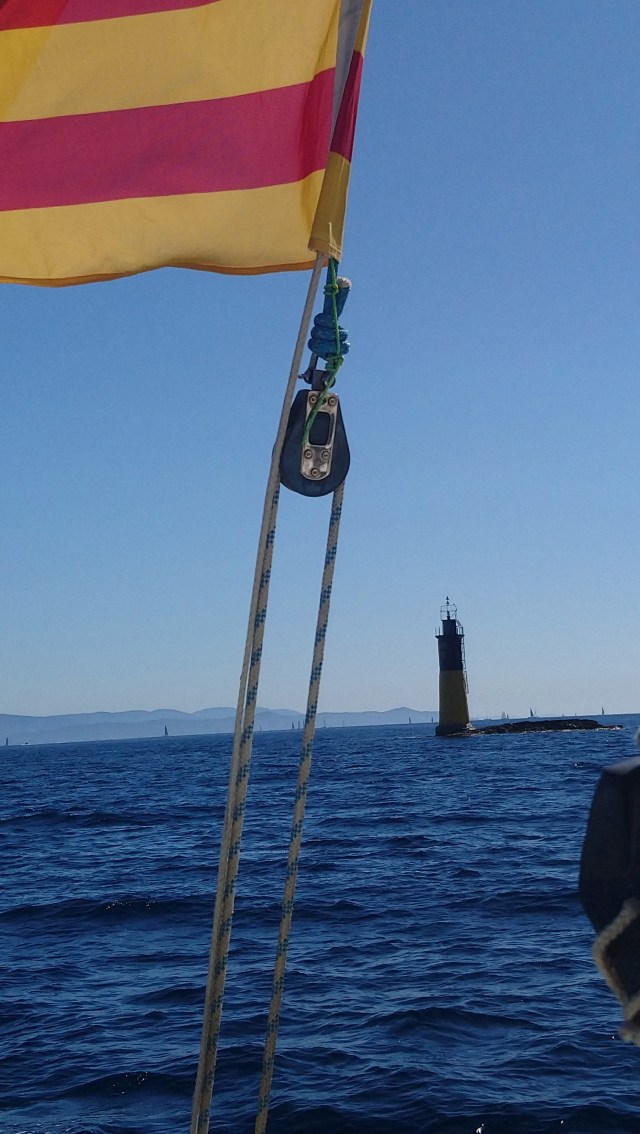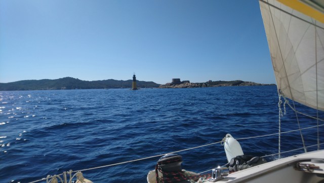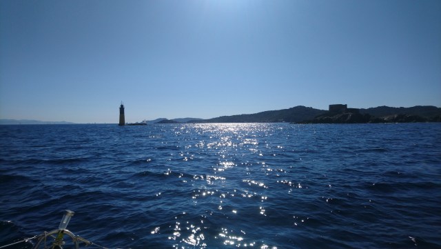 Dès la sortie de Porquerolles un bon vent d’ouest souffle déjà. Je prends le cap vers la tour fondue, lieu d’embarquement pour les gogos, et vire de bord pour retourner cap au large et tirer un long bord qui me permettra ensuite de faire cap direct sur la rade de Toulon.