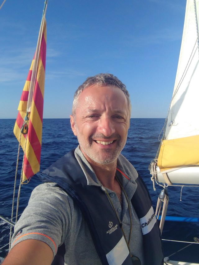 La météo annonce une fenêtre qui s’ouvre parmi les coups de vents et dépressions qui se succèdent depuis plusieurs jours. Cette fenêtre de 24h devrait m’offrir du bon vent d’ouest sans discontinuer avec encore de la houle résiduelle conséquence des tempêtes d’hier. Après un point météo précis et les conseils de Seb à distance me voici fin prêt pour la traversée. À une limite près… Il me manque une carte papier de la route. Car je n’oublie pas que malgré toute l’électronique du bord celle ci peut tomber en rade et moi avec… Je vais au magasin AD du port et en entrant dans la boutique, j’entends les vendeurs parler Catalan ! J’engage aussitôt la conversation le cœur réchauffé par des compatriotes.