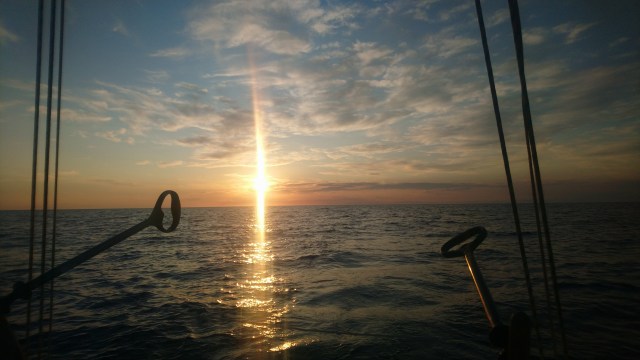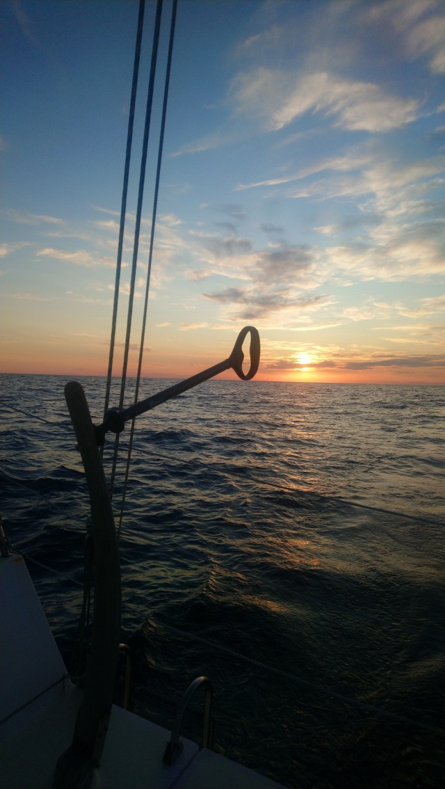 J’ai, depuis 21h30 affalé le gennaker car je reçois désormais le vent au près serré. La houle s’est apaisée depuis un moment et je glisse sur l’eau toujours sans mettre le moteur comme un funambule.