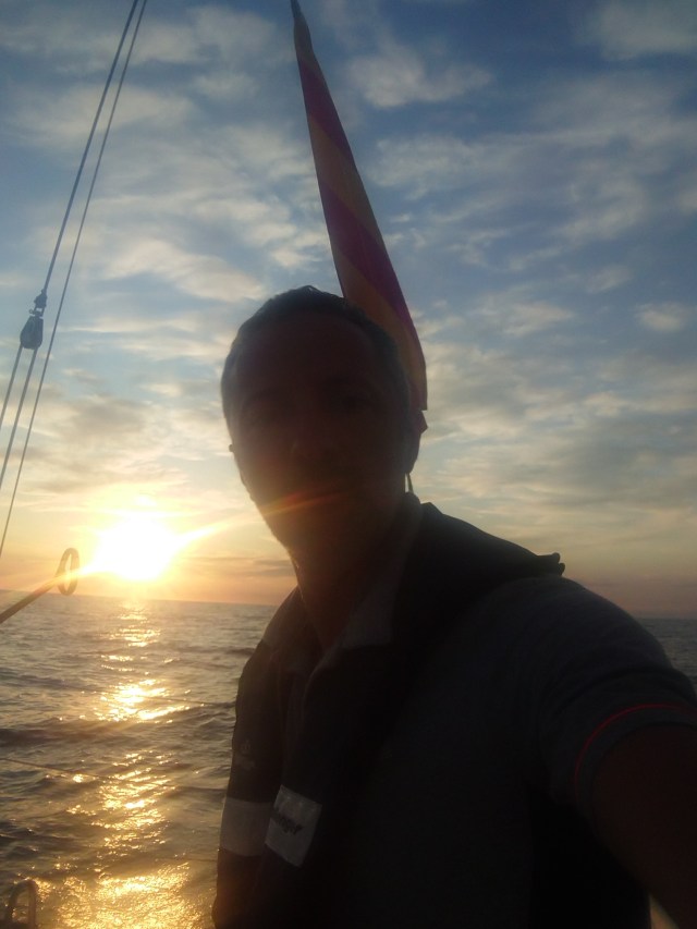 16h : le vent tourne maintenant progressivement pour venir plein ouest me permettant d’opter pour l’allure reine de Babar : le travers. Il est temps de changer la garde robe de Babar pour saluer ce vent de la meilleure des façons. Le gennaker est de sortie !
