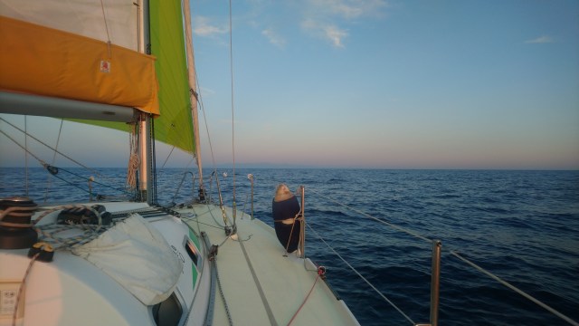Le large… Enfin. Je suis à plus de 15 milles de la côte maintenant. J’ai le cœur qui se remplit progressivement d’une joie immense. Le vent, le soleil, le scintillement de la mer… Et personne. Seul. Et puis une pensée : partir loin. Continuer vers la Grèce. Et même au-delà. Qu’est ce qui m’en empêche après tout ? Mais tout ceci n’est qu’un rêve d’enfant. Bien sûr un jour je l’accomplirai mais pas seul. La vie est parmi mes semblables, entouré des gens que j’aime et surtout proche d’une personne en particulier qui se reconnaîtra.