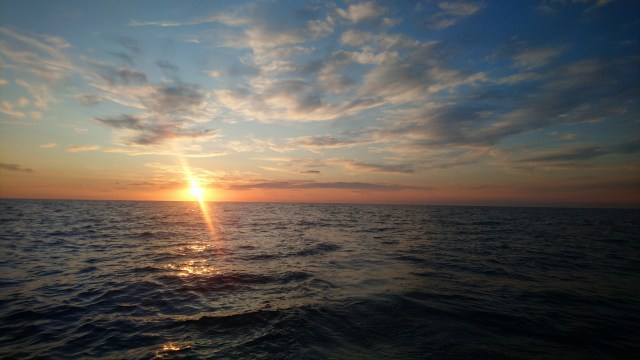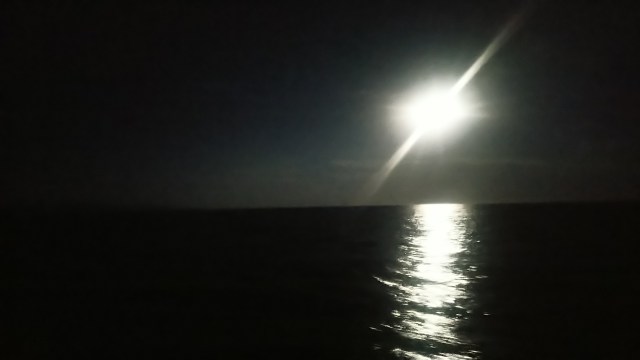 23h : c’est alors que soudain, enfin, quelques dauphins viennent à mon étrave. Ils ne restent pas longtemps mais c’est magique de les voir sous la lumière de la lune. J’entends leur souffle depuis le cockpit. Le temps d’aller à l’avant et ils disparaissent.