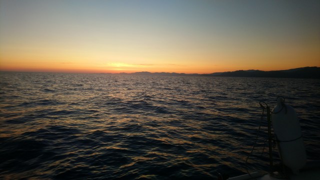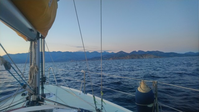 Le vent fraichit dans tous les sens du terme, m’obligeant à mettre ma polaire. Il est 5h30 et le jour se lève avec une belle brise de terre qui me porte déjà en Corse avec de puissantes odeurs de maquis mêlées à de la terre sèche mouillée par la nuit et quelques signes d’odeurs de cochons et de brebis… Peut être mon imagination.