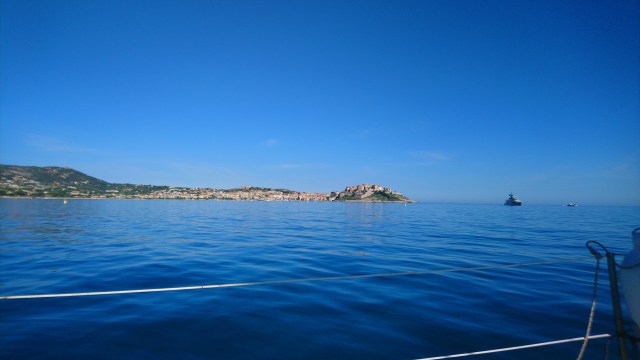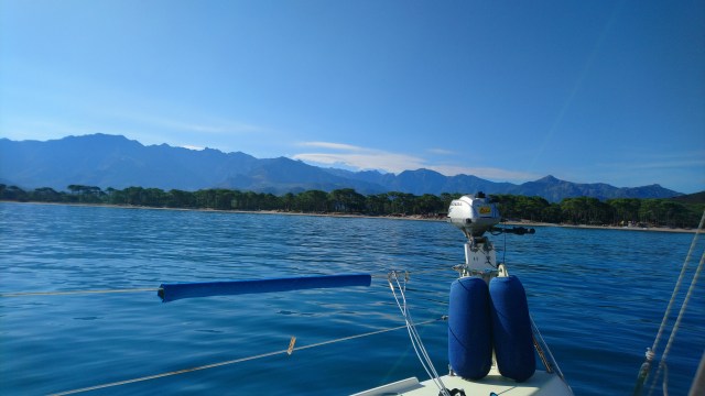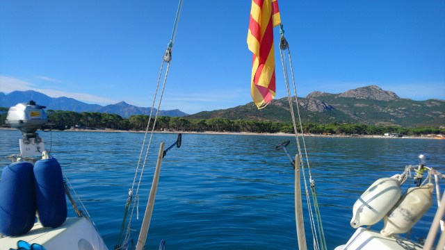 J’arrive maintenant à Calvi au bout de 18 heures de mer pour 95 milles nautiques tout à la voile ! Record à battre. Je choisis de poser l’ancre sur le plan d’eau vide de bateaux non sans saluer avec émotion les 2 bateaux échoués sur la plage certainement suite à l’énorme tempête d’avant hier.