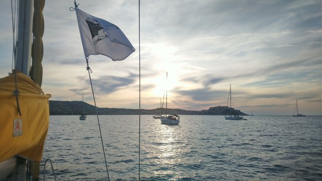 À 11h30 j’appareille et mets le cap au 128 degrés. Le vent est là et je zigzague entre les motor yachts mouillés dans le golfe jusqu’à la plein mer. Enfin… Un sentiment mêlé d’excitation et de concentration me prend tout à coup. J’attendais ce moment depuis plusieurs mois… Positionner l’étrave du bateau pile face au large.