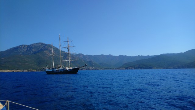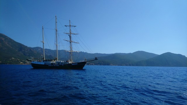 En arrivant dans le golfe de Galeria vers 17h30, nous croisons un sublime 3 mâts au mouillage. Je rêve de partir faire le tour du monde avec un vieux gréement, c’est une tout autre dimension de la navigation, en communauté et à l’ancienne. Il s’appelle le Kraken ! Bien nommé !
