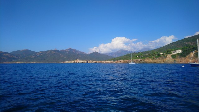 Ce soir c’est apero dînatoire sur le pont de Babar à écouter de la musique face aux montagnes Corse. Au loin, le Monte Cintu et 2 points blancs que je présume pour être des névés de neige.