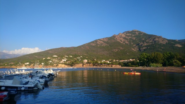 La cardinale Nord des élevages de poissons doublée, nous arrivons sur la zone des bouées de mouillage de Galeria devant un joli hameau. J’amorce un échange avec le bosco du port au sujet de mon pavillon Catalan. Quelques mots en Catalan, d’autres en Corse… Bref nous nous reconnaissons comme peuples libres et authentiques. Rendez vous est pris au bistrot la Piazzeta sur la place du village. Le temps d’une douche de mer, d’une balade et nous voici à prendre l’apéritif avec Fred, bosco mais aussi agriculteur (et oleicutleur) et pompier. C’est autour d’un Casanis que nous devisons autour de la vie et des la Corsitude des choses…