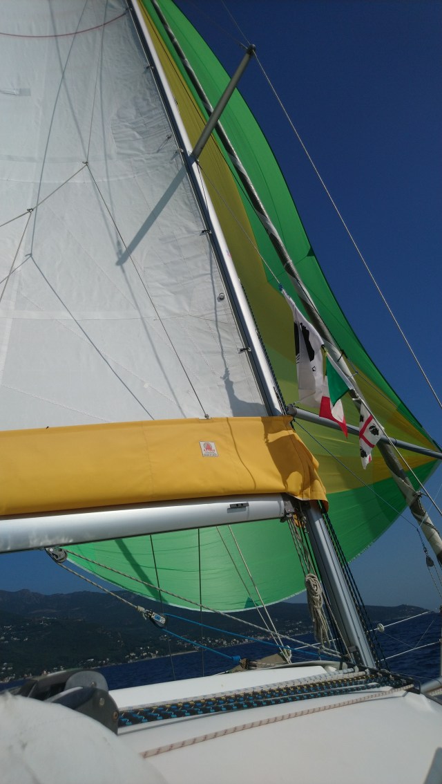 Nous partons de Bastia par un bon petit vent de sud est, idéal pour sortir le spi resté trop longtemps dans la soute. Il sent même l’humidité !