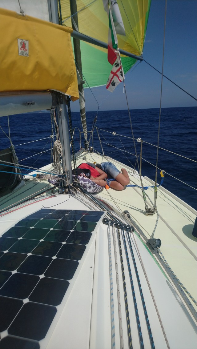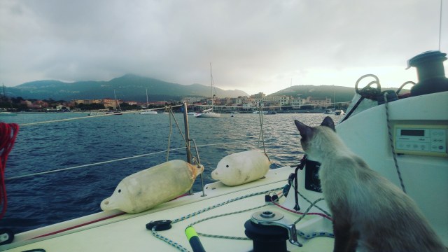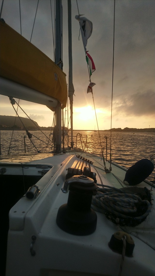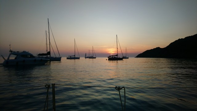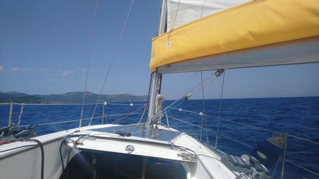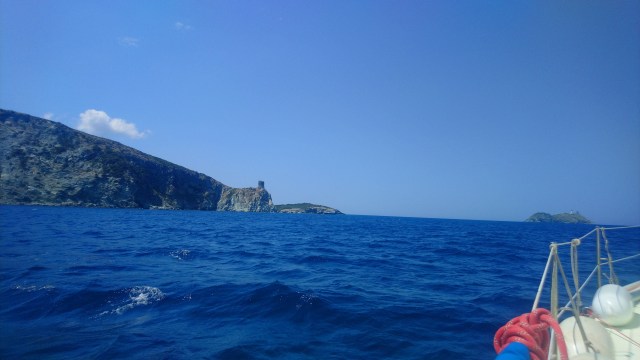 Mercredi matin je me réveille un peu grognon car j’ai très mal dormi. Je me lève et mets doucement en marche le moteur sans réveiller personne. Nous avons de la route jusqu’à l’île Rousse point de départ de la traversée retour vers le continent prévue demain. La navigation est plutôt désagréable avec pas de vent et de la houle tenace venue des motor yachts croisant dans les parages.