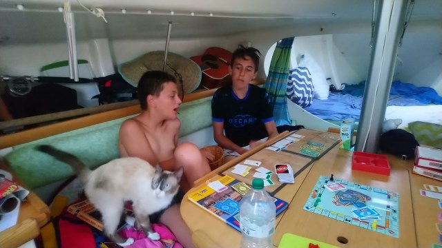 Nous voulons mouiller dans une crique du Cap mais je souhaite être plus à l’abri pour la nuit. Et c’est sur la côte occidentale dans le très joli Golfe d’Aliso que nous plantons la pioche sur un beau fond de sable blanc et d’eau turquoise. Les enfants vont s’en donner à cœur joie. Hélas le bonheur est de courte durée… Des méduses ont élu domicile. Tant pis nous nous occuperons en jouant au monopoly et en inventant de nouvelles règles !