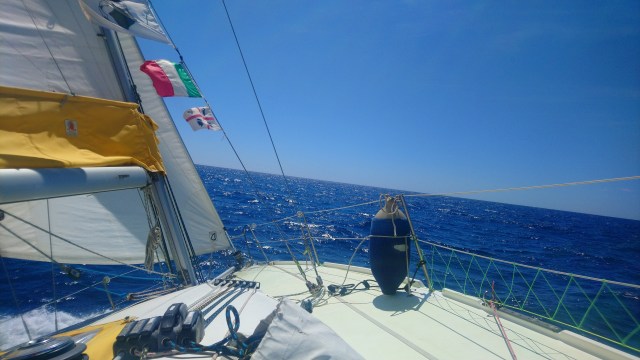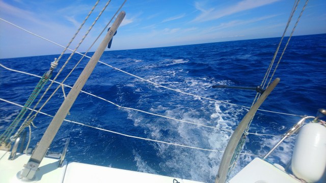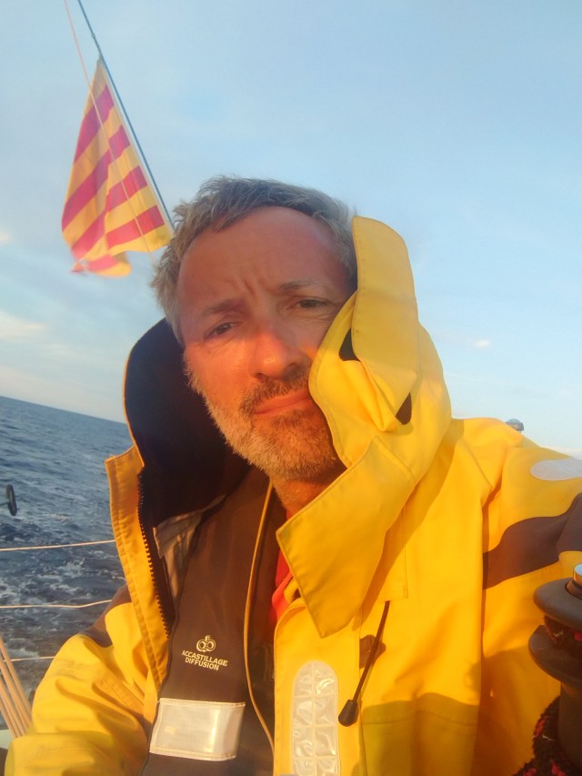 18h30 : alors que le vent fraichit un peu plus (en langage marin ça veut dire qu’il forçit) me permettant d’afficher une belle moyenne, j’assiste au spectacle de la mer avec des chasses de thons et de dauphins communs. Vu comme ça s’active là-dessous ça doit être la grande bouffe. Ça me donne faim ! Je rêve d’une grillade catalane…