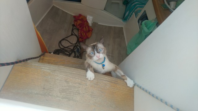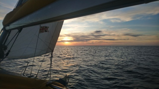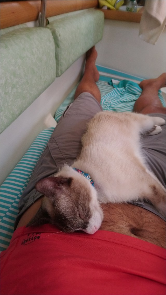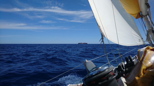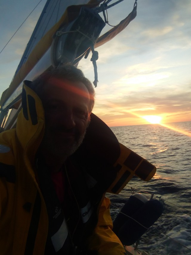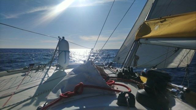 16h : nous sommes toujours au près serré par 15 nœuds de vent. Le bateau accuse une belle gîte et tout est inconfortable à bord depuis le départ. Se déplacer demande un effort, prendre une bouteille d’eau aussi. Quelque part, j’envie Solenzu qui dort comme une enclume. Je culpabilise de lui infliger cette situation mais je pense lui avoir donné le moindre des 2 maux : abandonné et affamé sur son port ou bien nourri, des câlins et un peu d’inconfort de temps en temps.