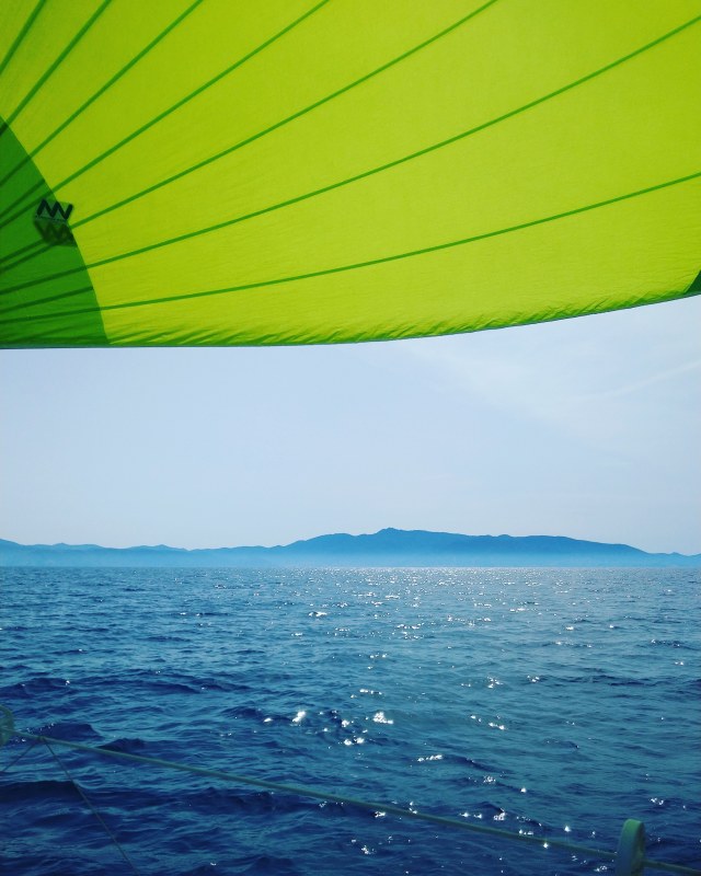Dimanche matin, pas un bruit, pas une ondulation sur le plan d’eau… Une odeur de terre mouillée et de pins titille mes narines en montant sur le pont. Je suis excité à l’idée d’aller à terre. Ce que nous faisons à la nage en ayant pris soin de mettre nos affaires au sec dans un sac étanche. L’eau est pure et fraîche et, à sa surface, je sens les fragrances puissantes de l’iode marine.