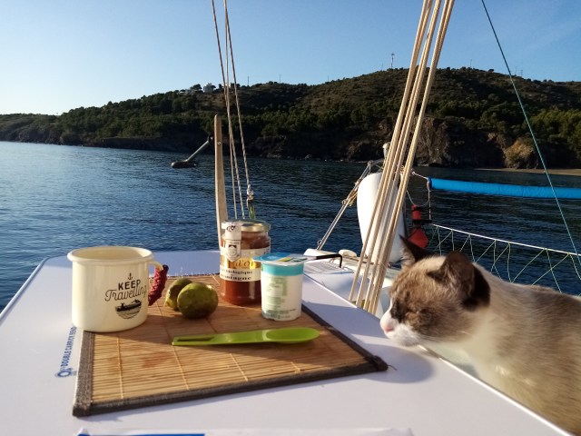 Le réveil dans la cala Sa Riera fut paisible après avoir subi là encore un vent fort toute la nuit. Place au petit déjeuner devant le spectacle enchanteur des pêcheurs qui s’affairent dans la baie.