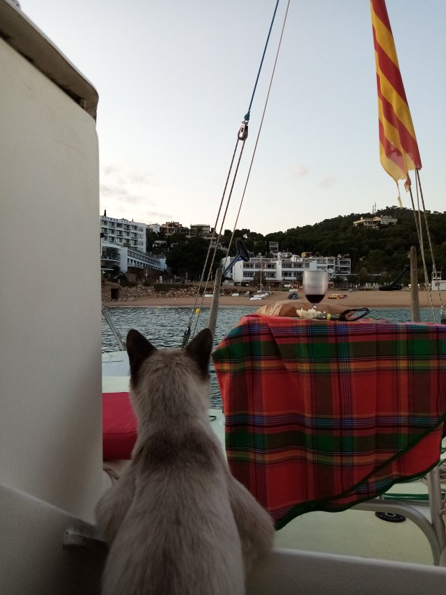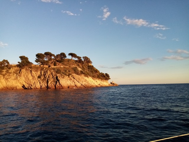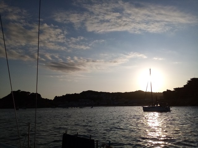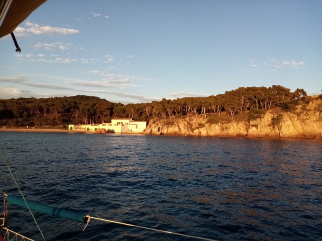Jeudi matin. Nuit pénible dans une machine à laver… Je décide de lever l’ancre pour chercher une crique plus à sud protégée de cette houle. Je continue 3 milles plus loin à la quête de cette cala salvatrice. Peine perdue, toutes sont ouvertes au large. Je decide de faire demi tour pour monter jusqu’à la cala de Castell au dessus de Palamos que je sais protégée. Et c’est parti pour une navigation tranquille à la voile de 15 milles.