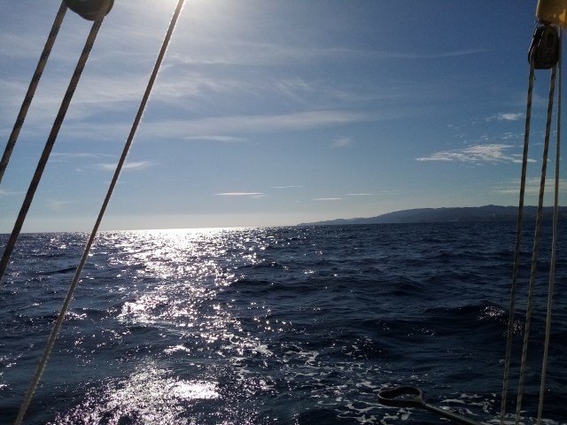 Je me sens comme dans le Grand Bleu… Dans les scènes calmes avec la mer métallique balayée par le vent. En harmonie douce avec elle, loin des excès de l’été, excès de température, de monde, de nuisances. Naviguer en octobre c’est naviguer comme il y a 40 ans. Peu de bateaux, aucun motor yachts ou jetski, étonnement pas de plastiques à la dérive… Bref un eldorado maritime. La seule contrainte vient de températures évidemment moins douces. Même si l’eau est à 19 degrés, suffisant pour moi pour me baigner.