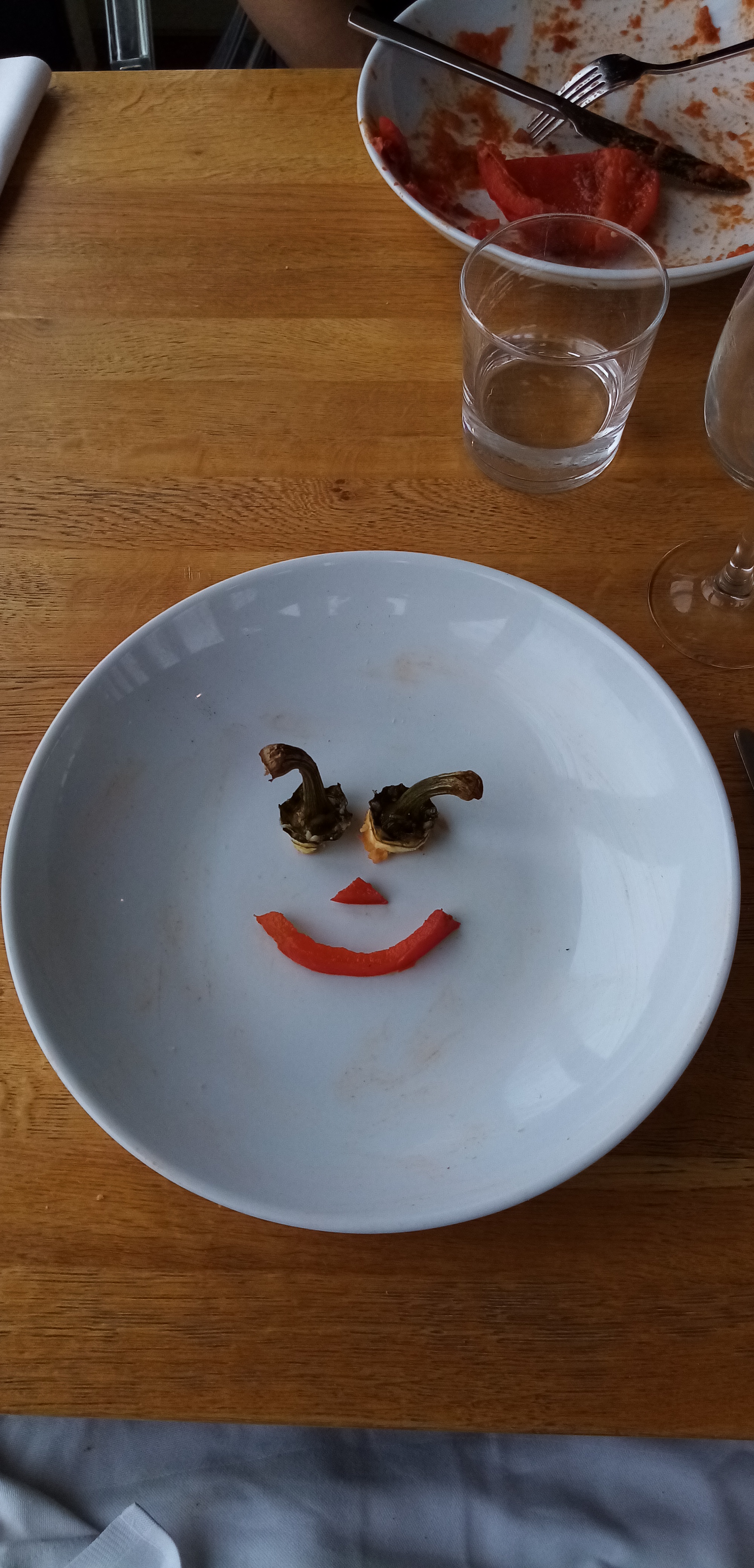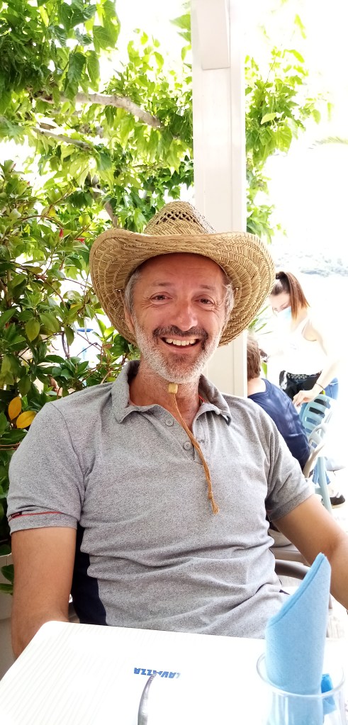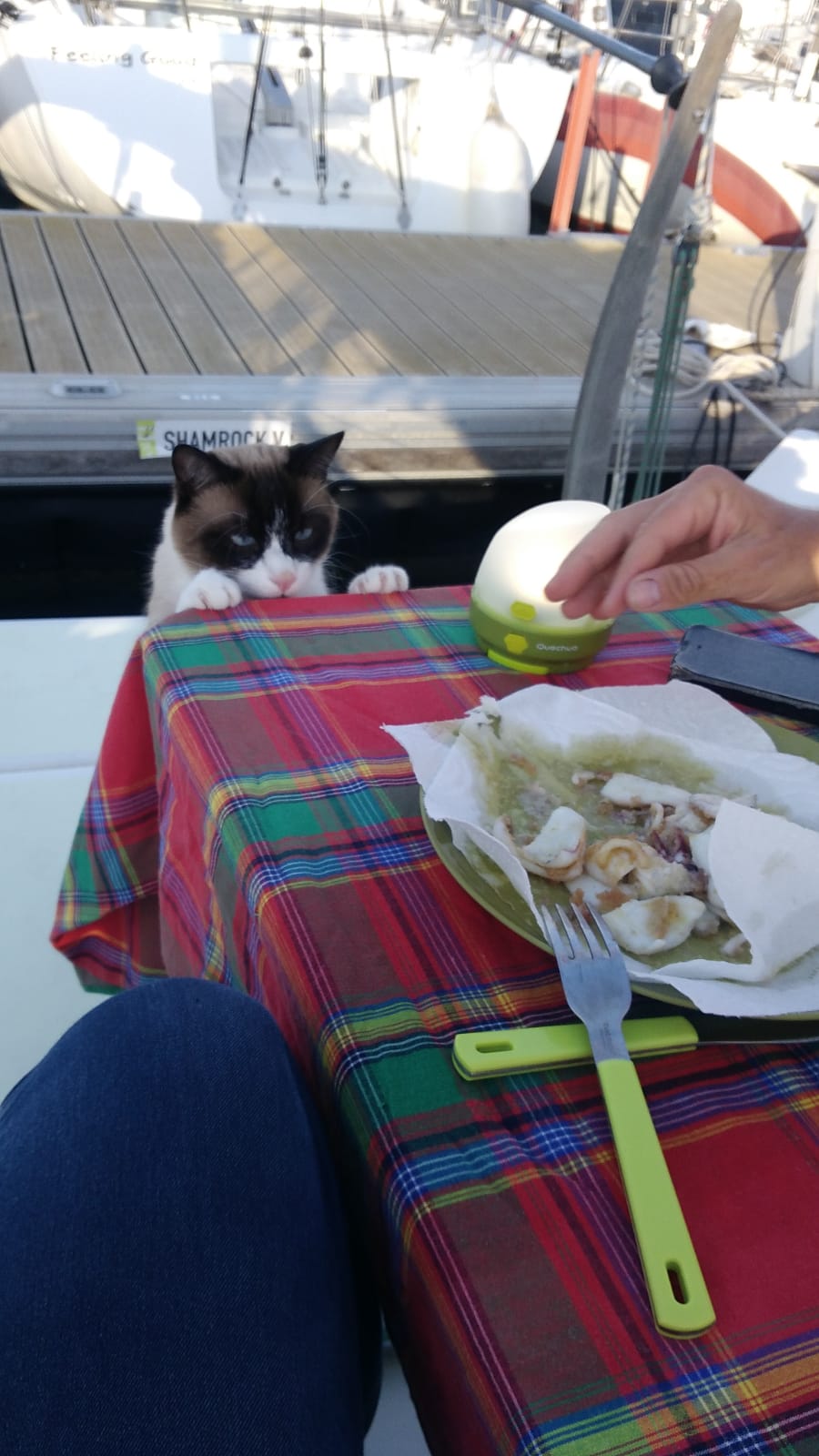 Le mauvais temps nous invite à nous faire plaisir et nous allons déjeuner au resto du club. Service impeccable, environnement très classe (sur une barge située dans le port et avec vue sur les bateaux) et repas délicieux. Pour remercier le cuistot je lui rends mon assiette avec une déco maison…