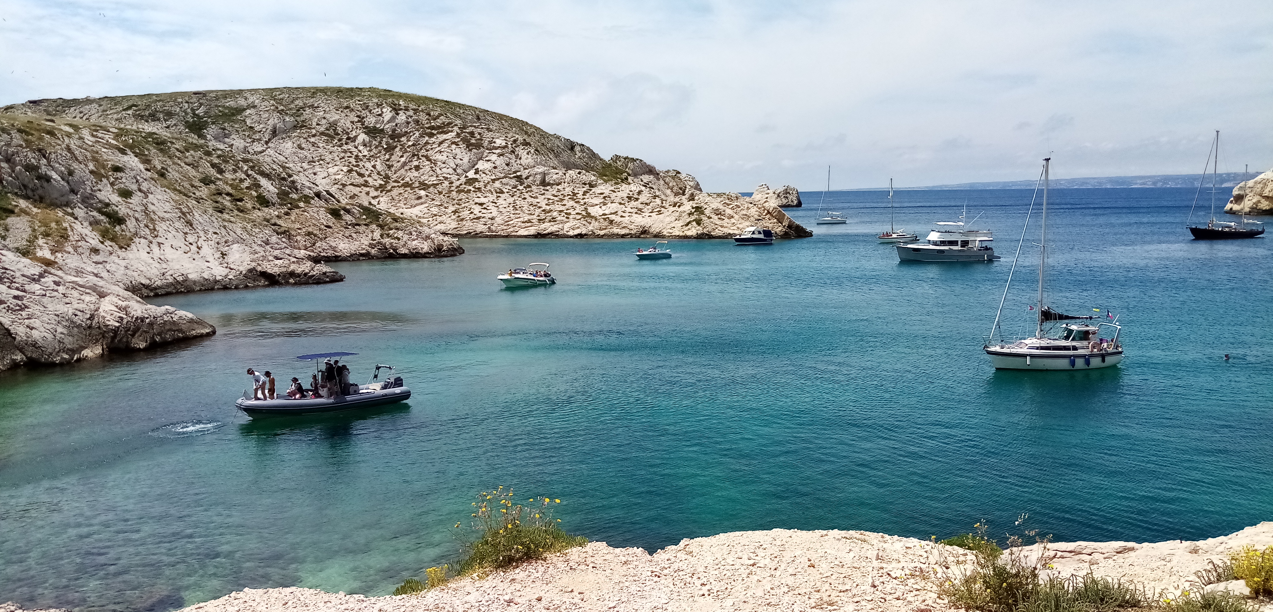 L’arrivée au Frioul était empreinte de souvenirs. L’an passé nous nous y sommes arrêtés Doriane, Solenzu et moi, pour une petite escale. L’environnement est lunaire fait de calcaire, d’éclats de soleils éblouissants se reflétant sur la roche et donnant à la mer un bleu clair caractéristique. C’est apaisant, comme un bout du monde devant la grande cité marseillaise grouillante. On s’y sent comme dans une douce mélancolie du temps qui passe.