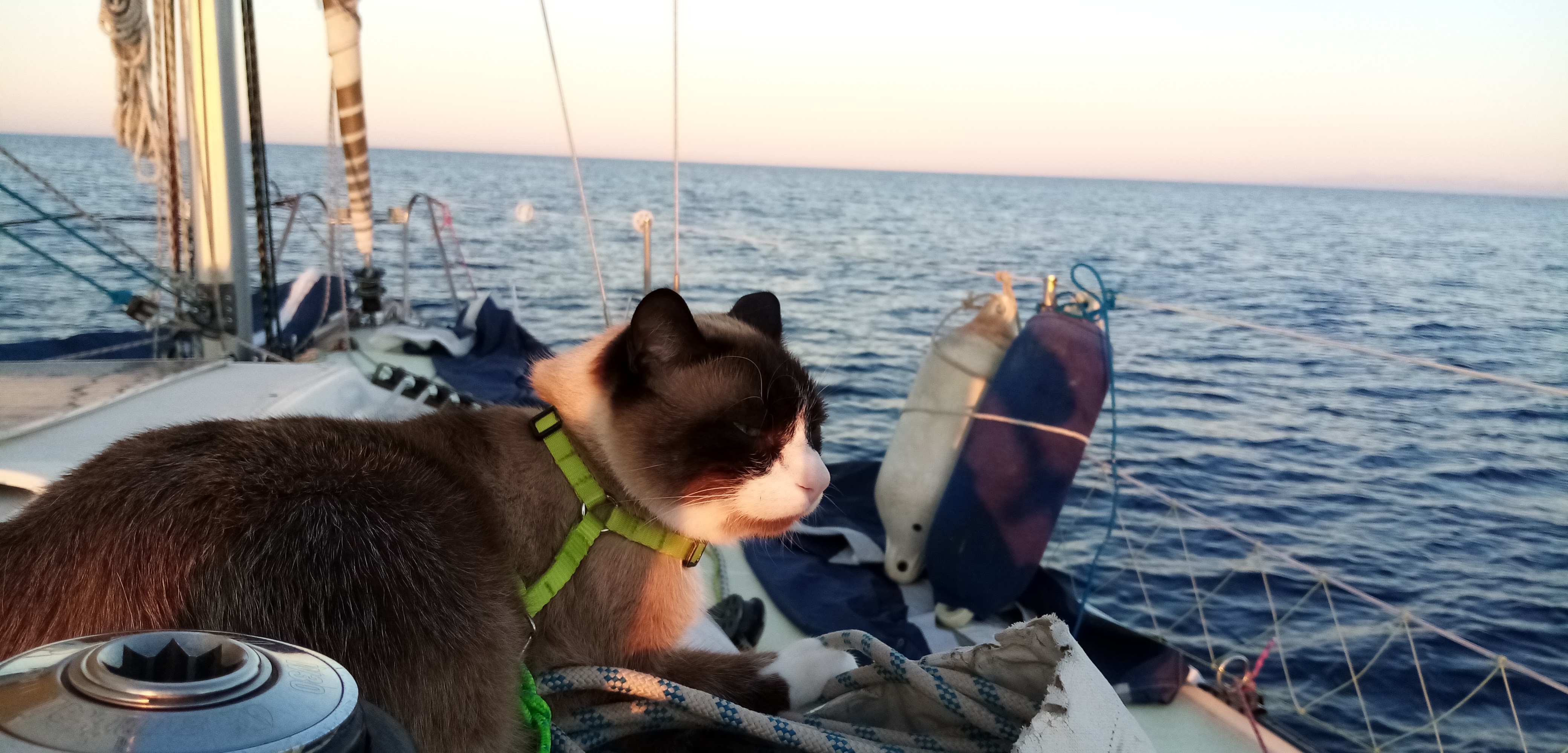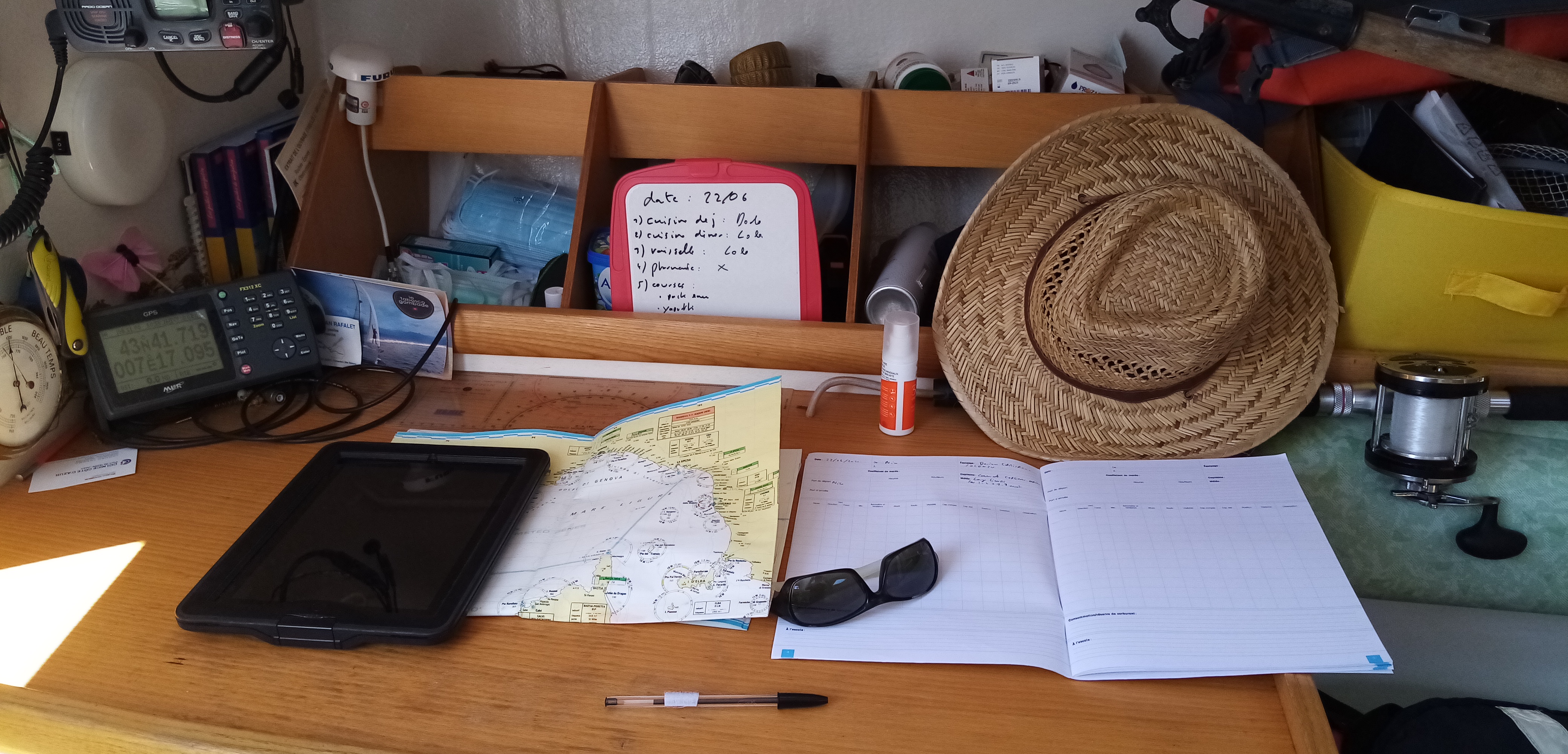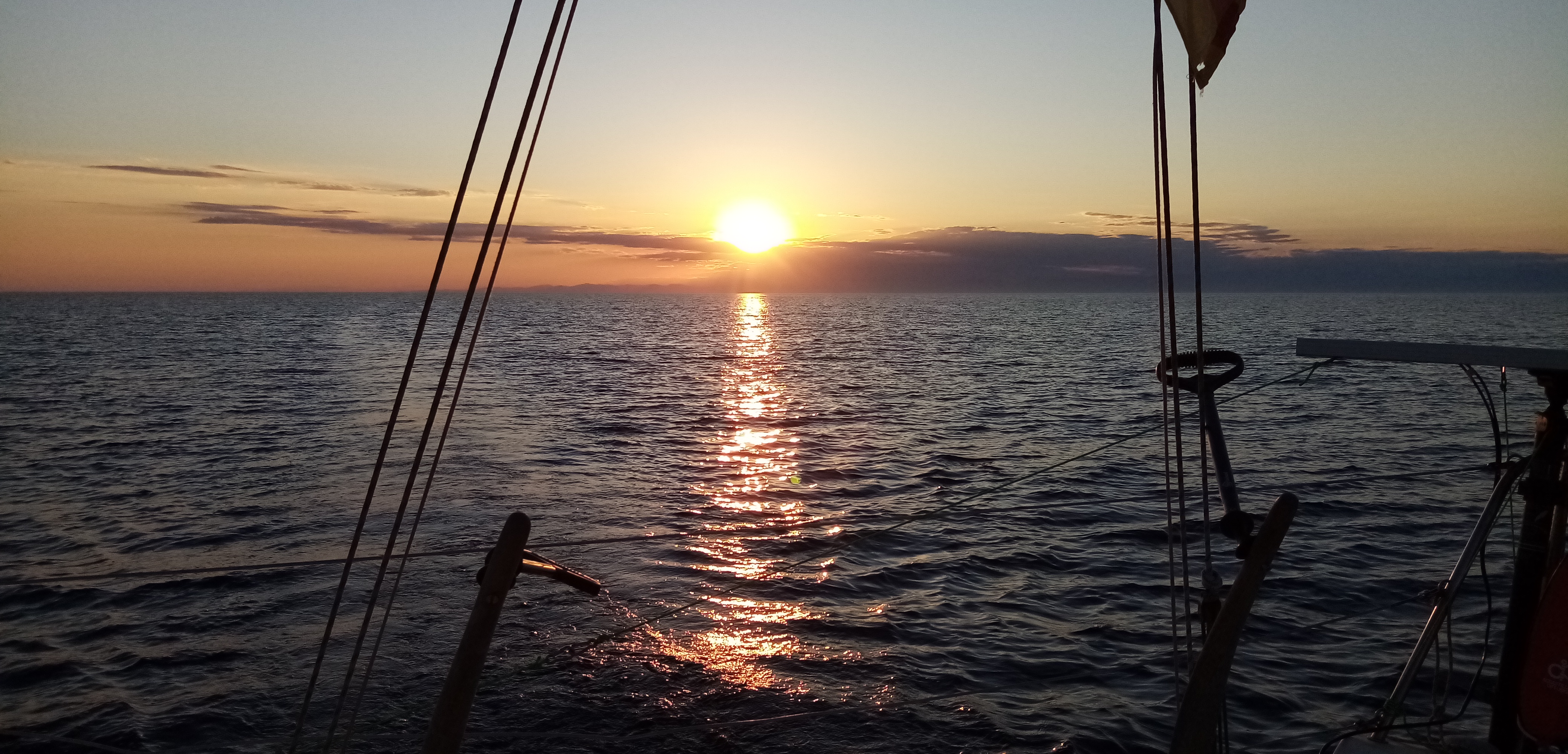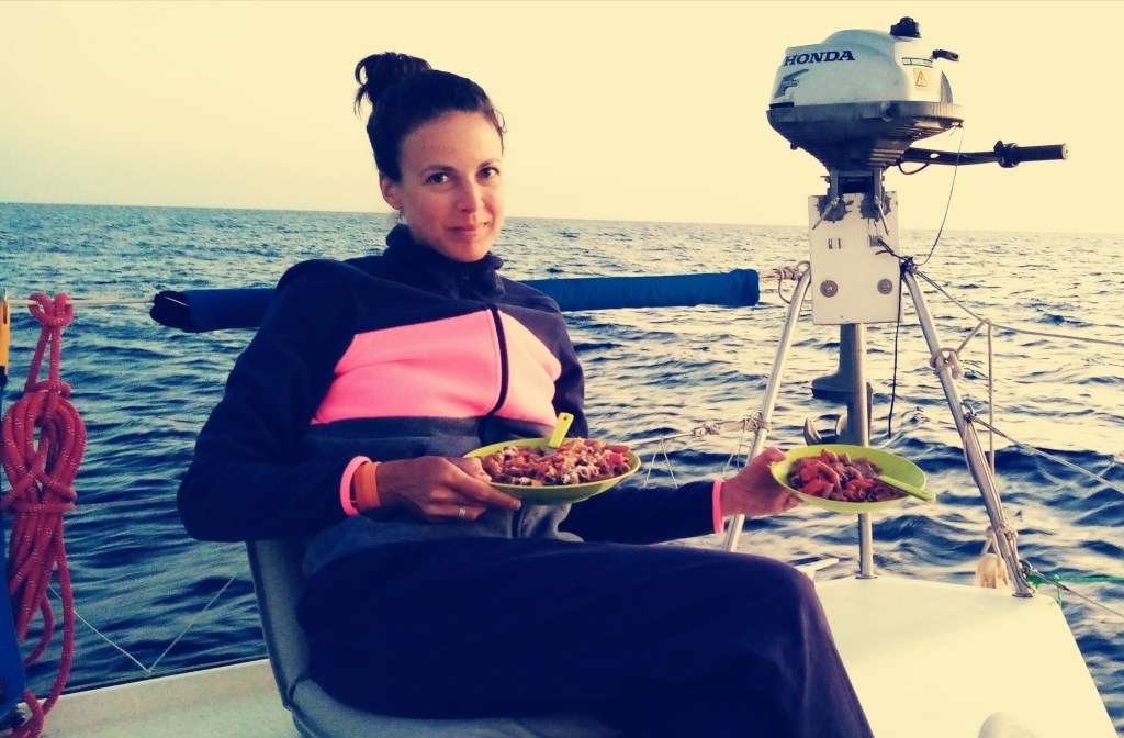 Petit à petit nous nous préparons à la nuit. Il a fallut hélas remettre le moteur à 18h30, la mort dans l’âme. Au menu c’est la Pasta maison servie sur le pont devant un coucher de soleil entre Alpes et Corse. Et oui nous voyons la Corse depuis presque le début, c’est une forme de déception car j’aurais aimé la découvrir, vierge de terre, à l’horizon.