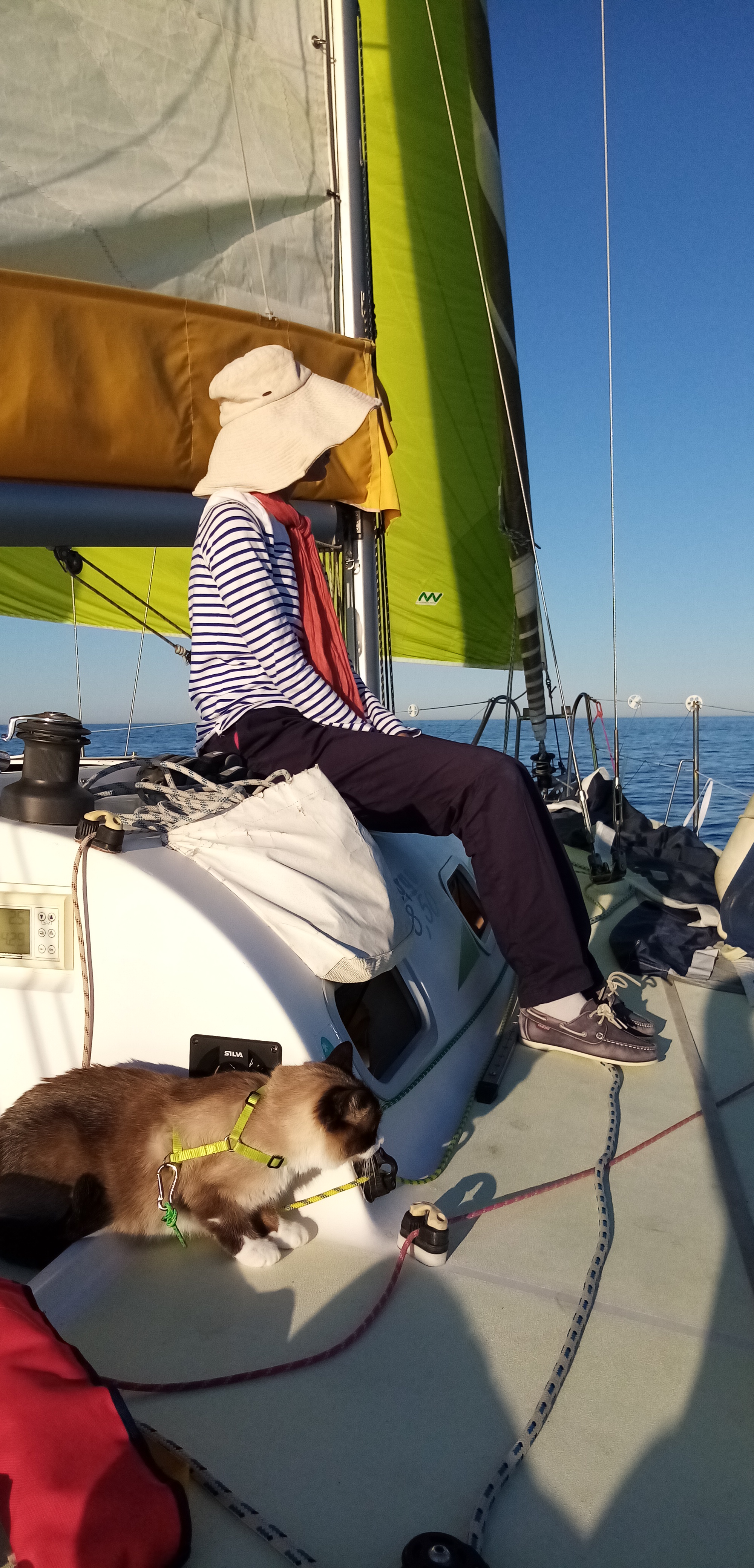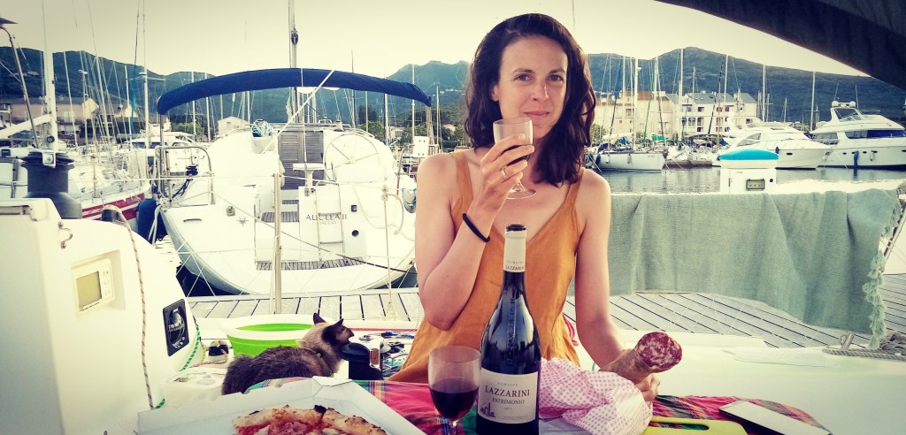 Ça y est on part enfin pour la 2e partie du voyage direction la Corse. Tout nous rapproche un peu plus de l’Italie, notre pays commun d’origines à Doriane et moi. Nous appareillons de Nice par un temps idéal, un petit vent parfait et une mer calme et belle. À bord c’est l’enthousiasme qui règne avec une pointe d’inquiétude. Les derniers appels à nos proches effectués et c’est parti cap au 112 degré ! La glisse est idéale, l’ambiance douce et Sousou ronque dans sa cabine. Une fois au large une houle assez lourde nous cueille par surprise. C’est la conséquence de ce satané Mistral qui tabasse encore le golfe du Lion. Il est temps de. Déjeuner et c’est Doriane qui s’y colle. De délicieux sandwiches !