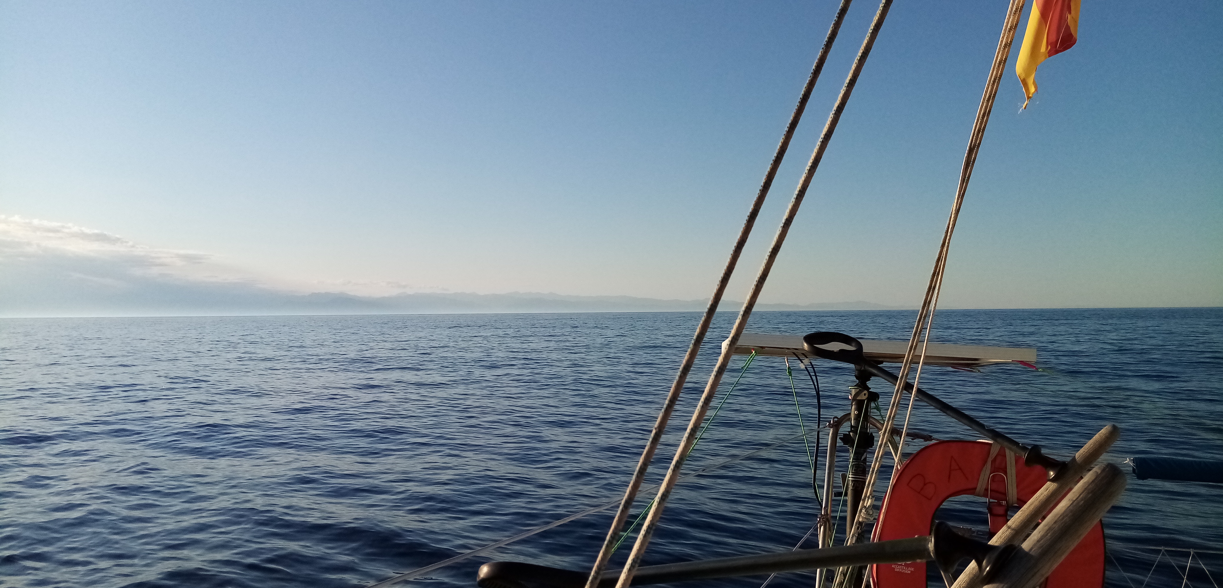 5h, le fameux liseré solaire vers l’est pointe le bout de son nez. Je vais réveiller Doriane pour qu’elle puisse admirer le spectacle avec la Corse, maintenant bien présente accompagnée de son odeur caractéristique quand on arrive depuis la mer. Nous restons ainsi tous les 3 à regarder et observer chaque nuance de couleur. La mer devient d’or au fur et à mesure que le disque solaire s’enflamme.