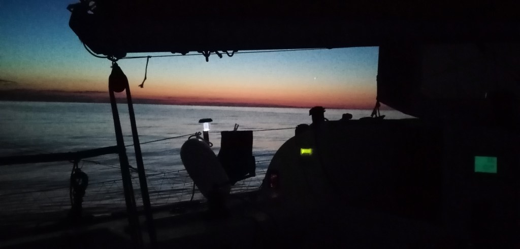 Vers 2h du matin le vent se renforce et vient du sud est. Je suis tout heureux de ce cadeau d’Eole qui autorise une nav à la voile à plus de 5 noeuds en pleine nuit noire. Quel bonheur.