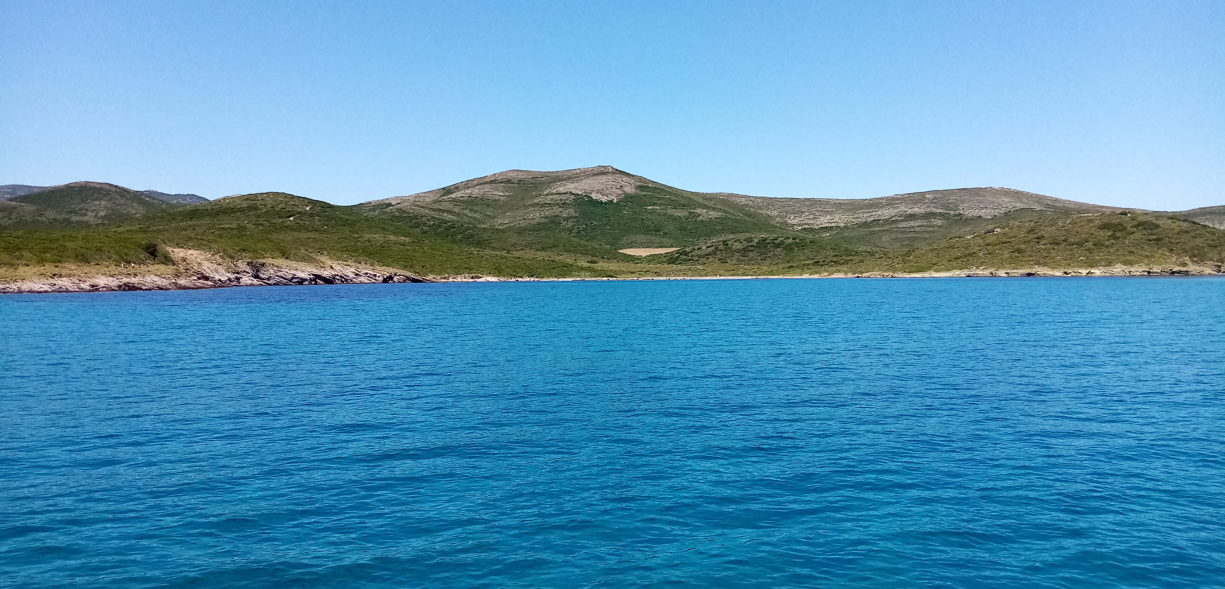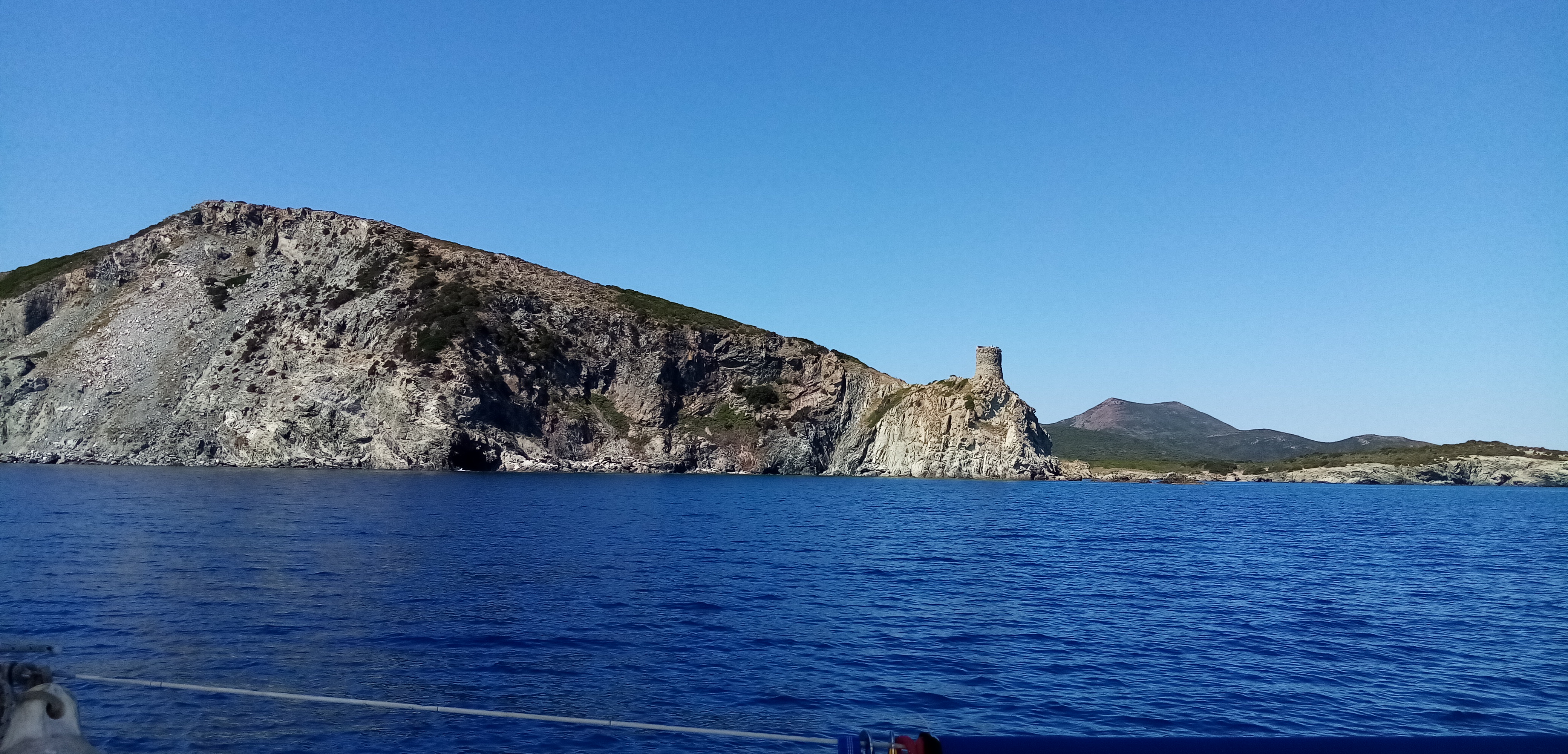 Toujours glissant à la voile depuis 23h30 la veille, on se faufile entre l’île de la Giraglia et le cap à la recherche d’une crique pour relâcher un peu le temps d’un repas, d’une baignade et… D’une bonne sieste. Les 3 seront délicieux. Les fonds sont sublimes, d’une transparence rarement vue, mais une eau encore fraîche. Séance snorkeling où j’ai vu de jolis poissons et surtout un mérou et une raie pastenague.
