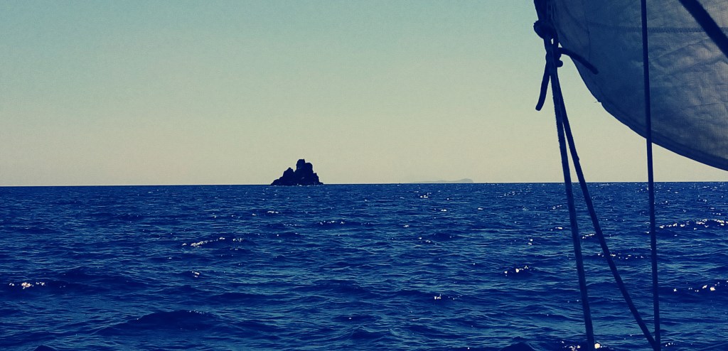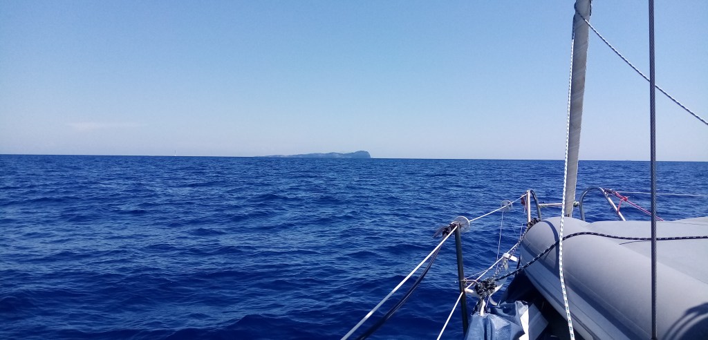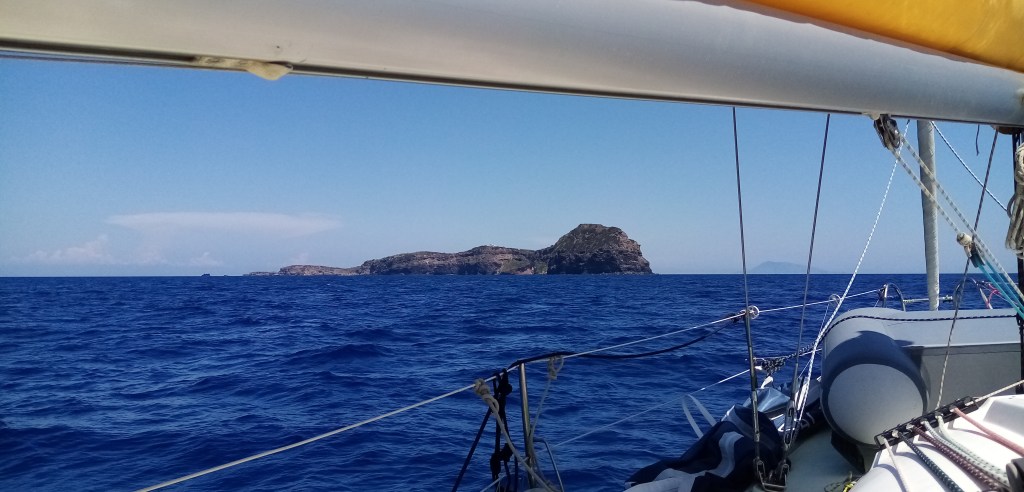 Ponza c’est beau mais trop beauf. On met le cap sur la petite île de Ventotène à 9 milles. Le vent n’est pas favorable et c’est en partie au moteur que ça va se passer. Au début, malgré tout, je reste à la voile pour apprécier l’île de Ponza dans notre tableau arrière. Jamais l’appellation de tableau arrière n’aura aussi bien porté son nom car c’est une véritable œuvre d’art que cette île vue de mer.