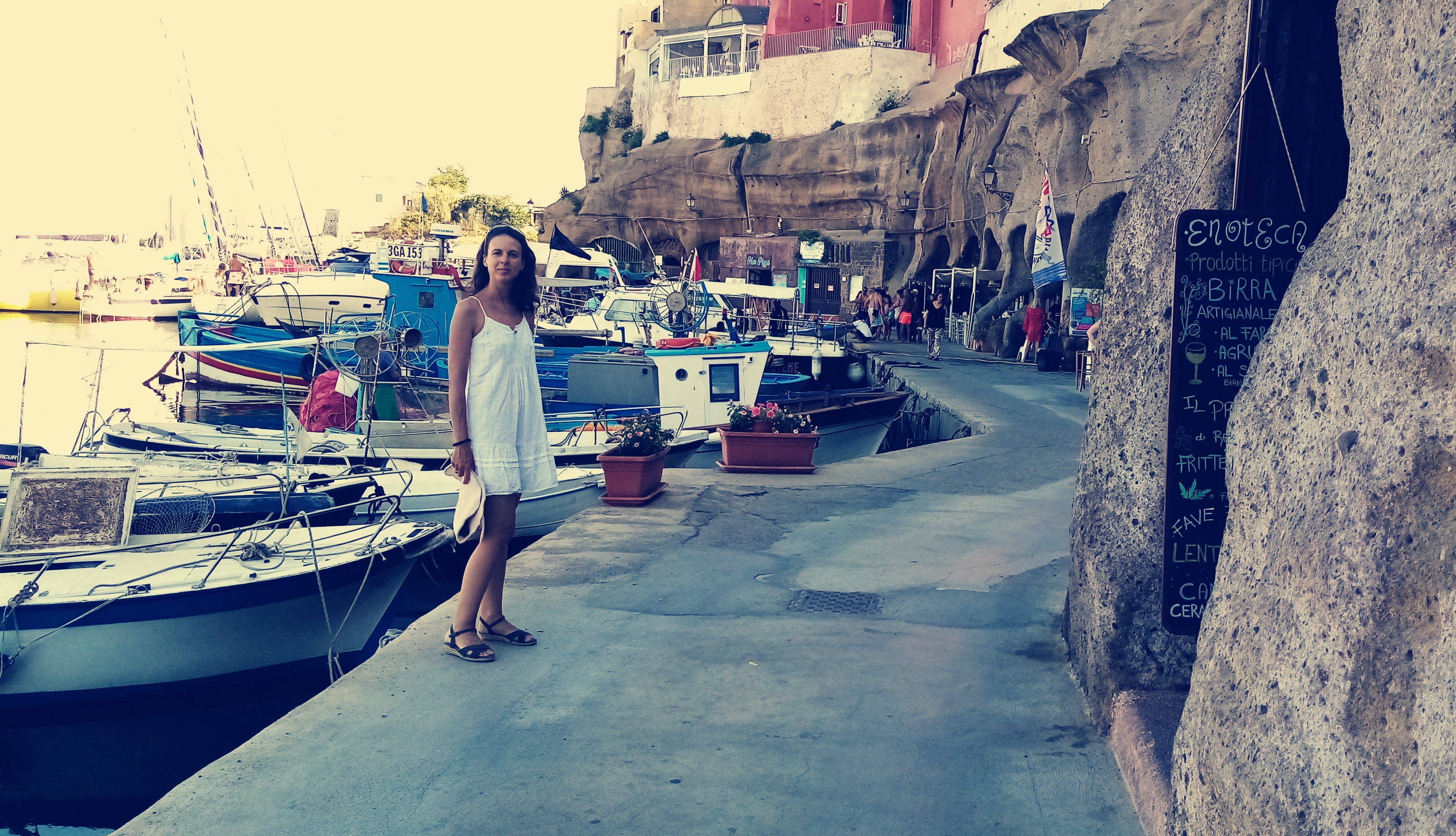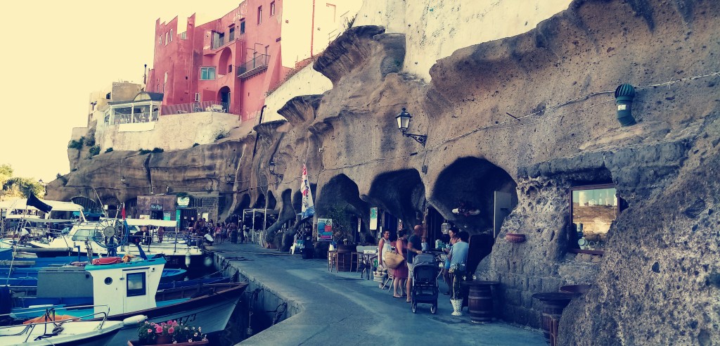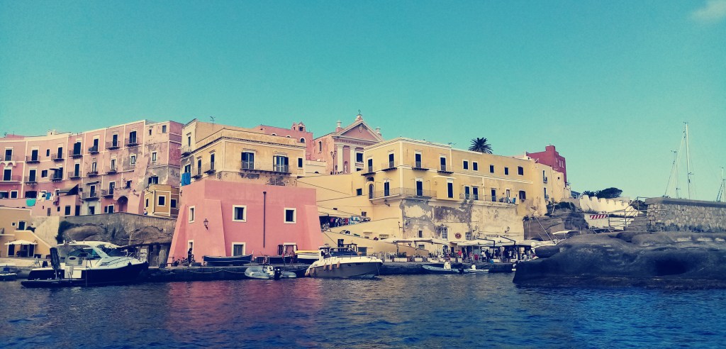 C’est une fois passé le gros cap Sud que l’on découvre le joyaux, comme un saphir blotti dans un coffre perdu dans quelque naufrage d’une galère romaine. Le coup de cœur vient de la mer. De hautes falaises du haut desquelles on distingue des petites villas colorées d’inspiration romaines antiques. Et puis du tuf volcanique, souvent utilisé par les Romains pour leur constructions, et des cultures, vignes, figues, oliviers… Et tout à coup le port! Un vrai port Romain intact et encore exploité aujourd’hui, autour duquel s’est construit, blotti contre lui, un magnifique village coloré. Nous mouillons l’ancre devant ce port antique qui a vu débarquer des empereurs Romains et admirons, incrédules la beauté du spectacle. Derrière nous, l’île de Santo Stefano qui hébergeait une prison et est aujourd’hui un sanctuaire marin. Triste de voir comme les hommes peuvent se surpasser pour construire des choses pour enfermer d’autres hommes.