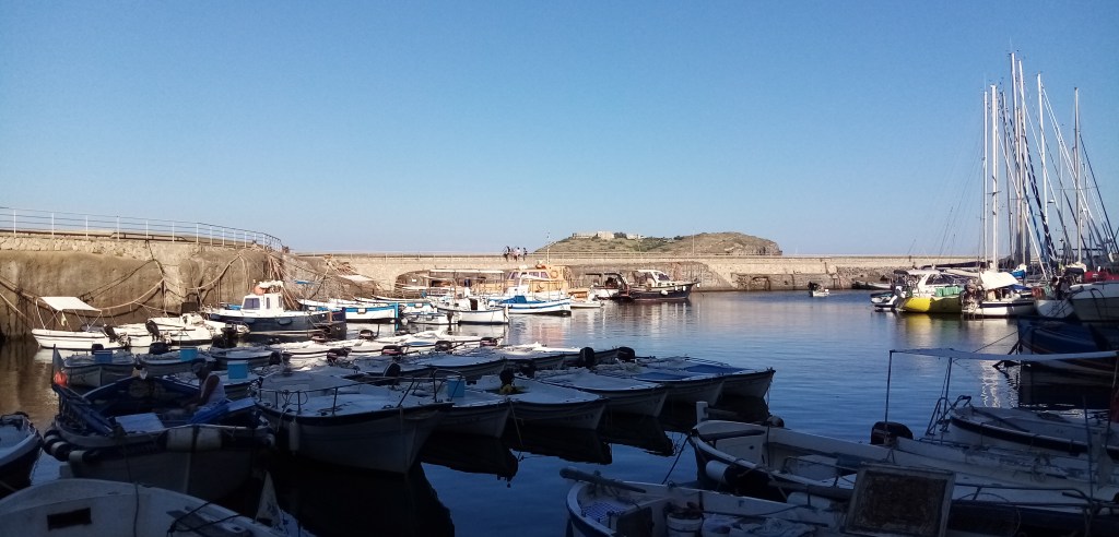 En montant vers les hauteurs du village, sous un porche, un « nonno » semble montrer un intérêt à notre visite, vient à notre rencontre pour nous guider vers les lieux à voir sur son île. Il nous explique avoir 80 ans et vit ici depuis toujours. Rien de cela ne peut arriver dans une grande ville d’aujourd’hui. Nous arrivons sur une jolie piazzeta où toutes les générations se mélangent et se côtoient. Et surtout… Quasi pas de touriste ! Sur cette petite place, chose insolite, on trouve une belle librairie maritime. Nous y entrons et découvrons de vrais trésors de littérature de mer sur la méditerranée. Hélas tous les livres sont en italien et je ne maîtrise pas suffisamment la langue pour lire un livre entier. C’est dommage car beaucoup d’entres eux m’auraient intéressés. Nous partons ensuite à la recherche d’un resto pour le soir. Notre dévolu va vers un restaurant avec petite terrasse vue sur mer, l’Afrodita. Mais avant, nous retournons au bateau pour se baigner, et ne pas se lasser de notre vue sur cet endroit si « particolare ». Le soir c’est apero dans un bistrot du port et pasta au scoglione (chapon). Nous rentrons ensuite au bateau avec l’annexe après avoir un peu abusé sur le vino bianco..