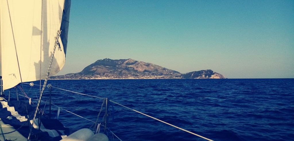 Heureusement que j’ai mis beaucoup de pare battage. Impossible de dormir c’est une vraie machine à laver. Je constate alors que Doriane est réellement amarrinée désormais car elle ne ressent aucun mal particulier, c’est la seule bonne nouvelle du jour. La danse va durer toute la matinée jusqu’à ce que le vent se calme pour que nous puissions partir en direction de l’île d’Ischia à 15h. En sortant du port un nouveau problème se pose à nous : le vent à totalement disparu des radars. La houle elle, est toujours un peu là. Ça sent la nav au moteur dans des conditions merdiques.